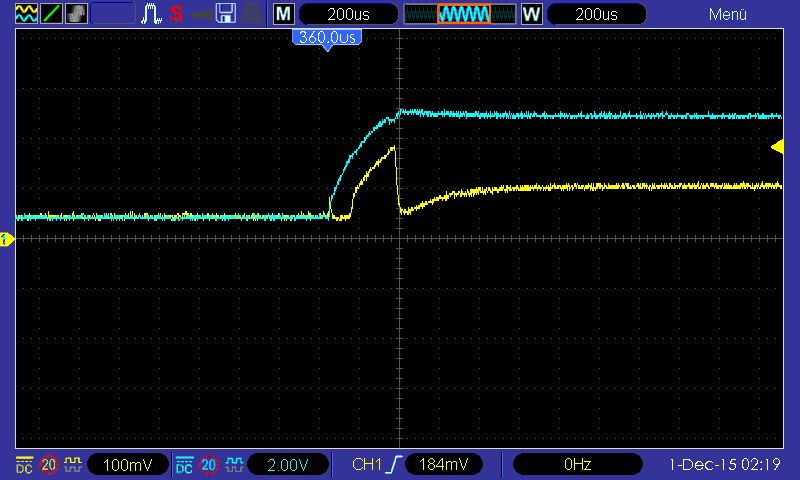 Falk B. schrieb: > Wie weit? 10cm oder 10m? Denke an 5 bis 10 cm. Falk B. schrieb: > Man könnte mit einer RC-Kombibantion das Gate des MOSFETs "hart" > ausbremsen, zumindest für 1ms, dann ist der Einschaltpuls weg. Eingebaut, aber keine Besserung, ganz im Gegenteil der schwingt jetzt einige Male bis er sich einpendelt. Im angehängten Bild sieht man Gelb die Spannung am Shunt und Blau die Spannung am Gate. Ich überlege mir morgen etwas vernünftiges zum Einschalten. Vielen dank für die Hilfe. Gruß Rainer