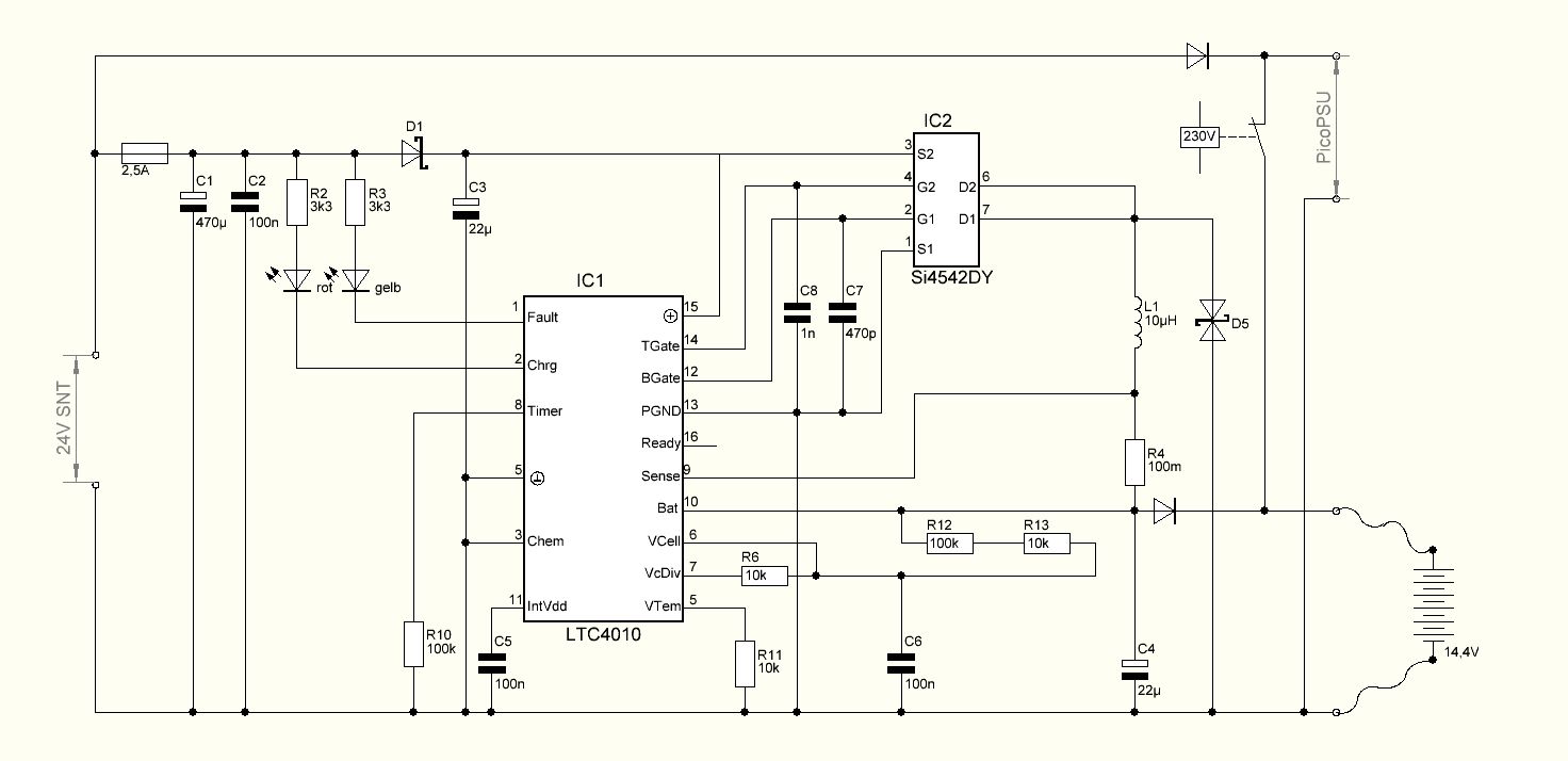 Ich habe mich nun für einen NiMh-Laderegler entschieden. Versorgungsspannung 24V, Akku-Spannung 14,4V .. folglich Weitbereichs-PicoPSU. Wie würdet Ihr die Umschaltung realisieren ? Einfach einen PNP-Transistor mit Base und Poti (für Schwellspannung) an "+24V" und Emitter an "+" von Akku ?