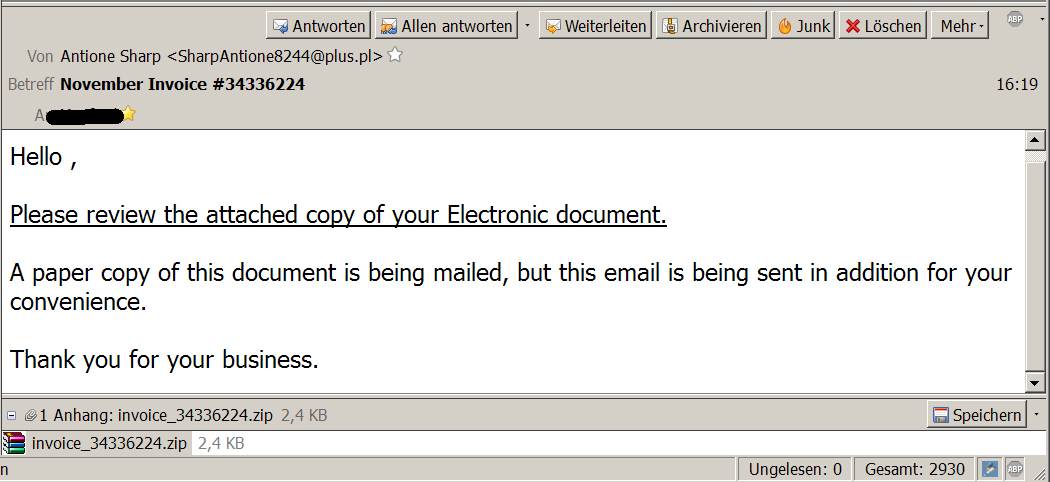 Man, das sieht doch jeder schon am Englisch, daß da was komisch ist. Außerdem - wenn das Dokument sowieso per Post kommt, kann ich die eMail auch in die Tonne treten. Und wenn eine eMail reichen würde, bräuchte man den teureren Postweg nicht. Also eine ganze Menge Ungereimtheiten, an denen man den Phishing-Versuch erkennen kann. Anhang KEINESFALLS öffnen, eMail löschen und alles wird gut.