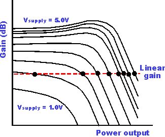 Hm, dann hole ich noch ein wenig mehr aus. Beim Envelope Tracking gibt es die Möglichkeit den Verstärker zu linearisieren. Hierzu kann man eine Versorgungsspannungsmodulation machen. In der Grafik oben, sind die Punkte für die Gewünschte Verstärkung eingezeichnet. Nun zu meiner Frage, da man die Versorgungsspannung Moduliert, kann man den Arbeitspunkt des Transistors so einstellen, dass dieser die gleiche Verstärkung aufweist. (siehe oben Bild) Die letzten 6 Punkte (von rechts gezählt) befinden sich doch alle im Sättigungsbereich des Transistors, erzeugt er mir dann da keine Verzerrungen ?