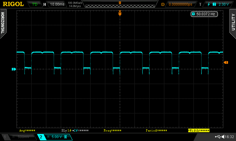 Bei 2 anderen Netzteilen sind es 10ms Periodendauer und ca 50% duty cycle. Wenn ich die Spannung abschalte, habe ich langsam abfallende 5V=. 2 USB-Netzteile zeigen ein ähnliches Bild. Das eine liefert aber kein "schönes" Rechtecksignal (Anhang).