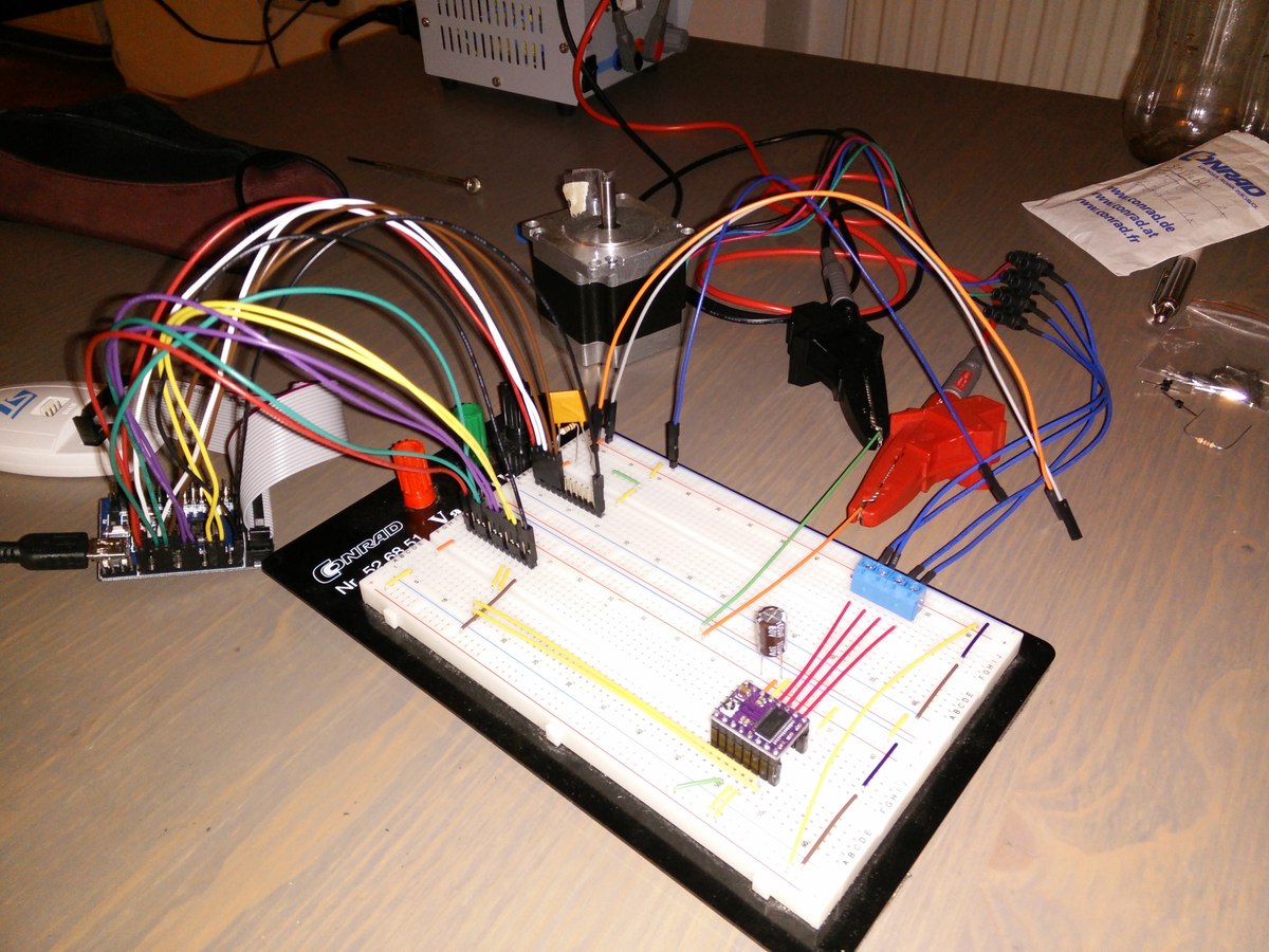 Johannes O. schrieb: > Hast du mal eine einfache Mittelwertbildung ausprobiert? > Also anstatt alle 10ms abzutasten, beispielsweise alle 1ms und dafür > über 10 Messungen zu mitteln? > (Wenn du das noch optimiert machen willst, dann mittle über 2^N > Messungen, das geht meist einfacher/schneller beim Berechnen). > > Ansonsten kannst du auch mal deinen Aufbau hier posten, du kannst dir > Störungen auch extern einfangen. Das war ein guter Tipp, die Mittelwertbildung hat das Problem tatsächlich gemindert. Ich habe auch ein paar Blogposts gefunden, in denen für solche Anwendungsfälle eine Medianbildung empfohlen wird. Theoretisch müsste diese wirklich sehr gut geeignet sein -- der Nachteil dieser Lösung ist halt die Rechenzeit, da eine ständige Sortierung der Samples notwendig ist. Auch der Hinweis mit den externen Störungen war richtig. Anbei ist ein Bild vom Aufbau. Es scheint, als hätte ich mir über die 10cm-Leitungen an denen die Entwicklungsplatine mit dem µC die Einstreuungen eingefangen. Quelle der Einstreuungen ist der Schrittmotortreiber unten-links. Wenn ich ihn deaktiviere, tritt quasi kein Rauschen mehr auf. (Übersprechen zwischen den 10cm-Leitungen dürfte kaum stattfinden, da die meisten davon noch elektrisch tot sind.)