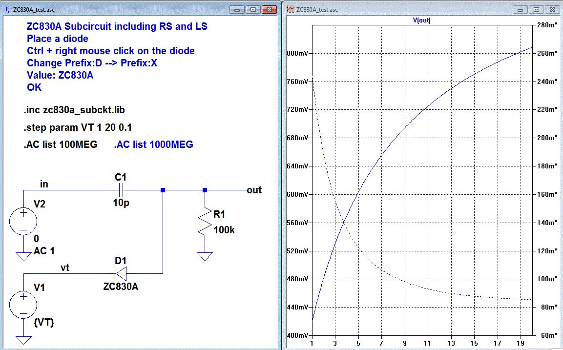 Ich habe ein subcircuit gemacht das die Serieninduktivität LS und den Serienwiderstand RS enthält. Diode im Schaltplan platzieren Ctrl + rechte Maustaste auf die Diode Ändere Prefix:D --> Prefix:X Value: ZC830A OK Diese Datei immer in das Verezeichnis des Schaltplanes kopieren. Im Schaltplan dann noch die Datei mit der Komamndazeile ".inc zc830a_subkt.lib" bekannt machen. Die Originaldatei habe ich nur der Vollständigkeit halber angehängt. Gruß Helmut