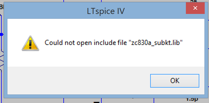 Hm, nun habe ich doch noch eine Frage. Ich habe, so wie du es beschrieben hast in Ltspice eingebunden und auch den Pfad mit ".inc zc830a_subkt.lib“ bekannt gemacht. Jedoch will Ltspice diesen nicht finden und gibt mir die Fehlermeldungwie oben im Bild gezeigt. Was mache ich falsch. Ich habe es in den Projektordner in der meine Schaltung ist hinzugefügt.