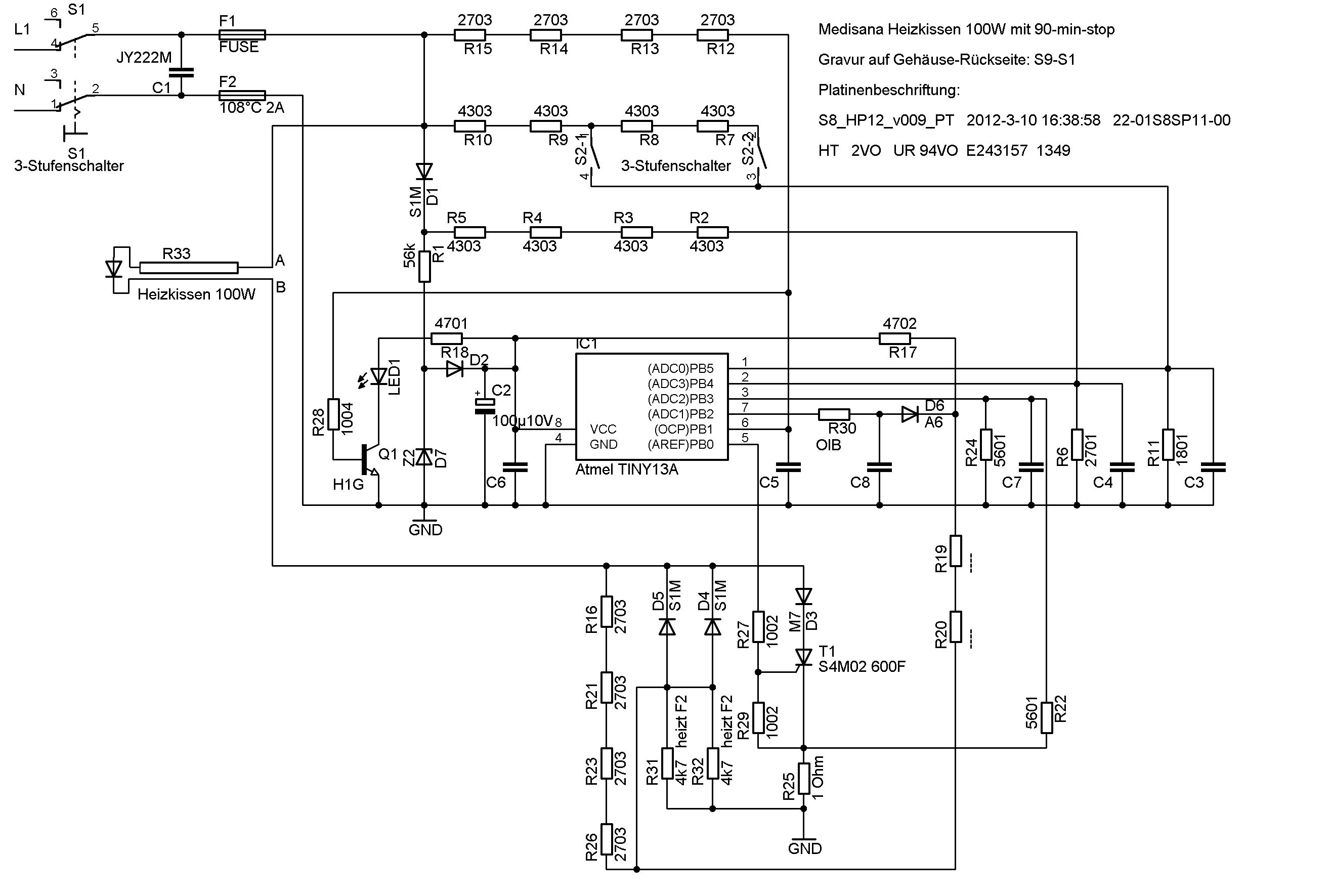 3-Stufen-Schalter 0 - 1 - 2 - 3 Gravur auf Gehäuse-Rückseite: S9-S1 Platinenbeschriftung: S8_HP12_v009_PT 2012-3-10 16:38:58 22-01S8SP11-00 HT 2VO UR 94VO E243157 1349 Anbei Schaltplan und Bauteilliste. Prozessor ist ein ATTINY13A TINY13A. Unklar ist, ob die beiden unbezeichneten Rs (im Plan nenne ich sie R31 und R32) vorher auch schon 4k6 hatten und warum sie verbrannten. Sie sind unmittelbar um eine 108°C-Thermosicherung angebracht und sollen sie vermutlich gezielt auslösen können. Ich habe eine Idee, will aber zuerst Eure geschätzte Meinung hören. Typenbezeichnung und Hersteller folgen noch! Ebenso unklar ist die Funktion: Ich vermute Wellenpaketsteuerung, aber der Thyristor T1 kann ja nur Halbwellen schalten, die andere Halbwelle geht über die beiden anders herum gepolten Dioden D4 und D5. Das Kissen ist 2 Jahre alt (Garantie gerade abgelaufen) und hat nur 46 Ohm, das könnte zu wenig sein, da 230V / 46 Ohm = 5A. Aber selbst bei 250 oder 500 Ohm dürften die R31 und R32 ziemlich schwitzen.