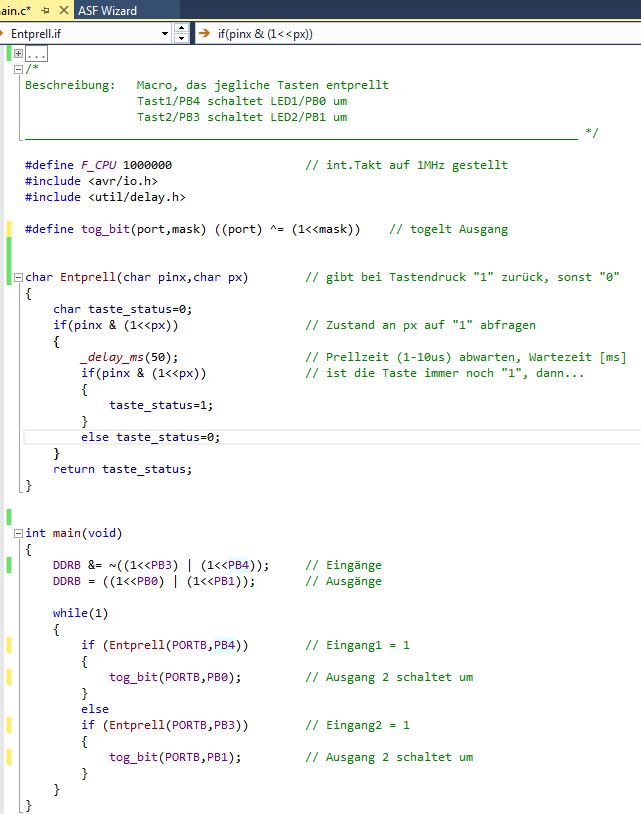 __Son´s B. schrieb:> Karl H. schrieb:>> Wenn es im Buch als Makro geschrieben ist,> Nein!> Weder Macro noch Funktion - steht auch nirgens.>> Folgend die Original-Zeilen;> int main()> ...> while(1)> {> if((PIND & (1<<PD2)) == 1)> {> _delay_ms(50);> if((PIND & (1<<PD2)) == 1)> {> PORTD ^= (1<<PD6);> while(PIND & (1<<PD2));> }> ...