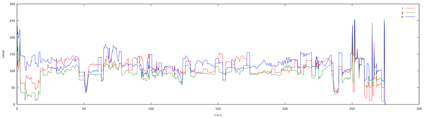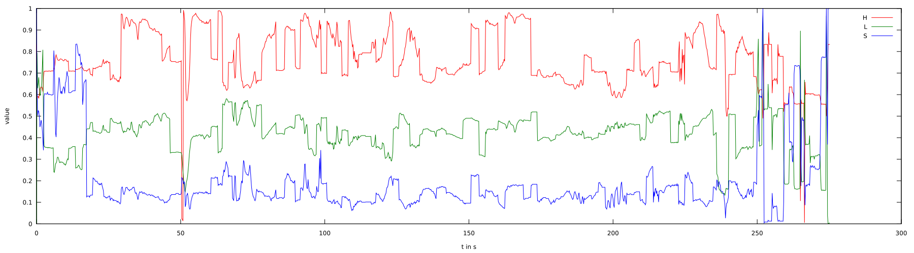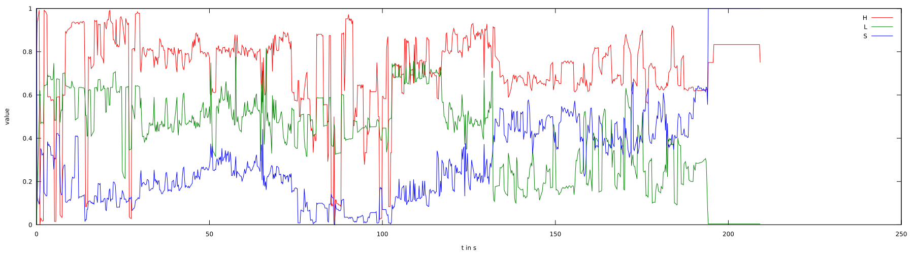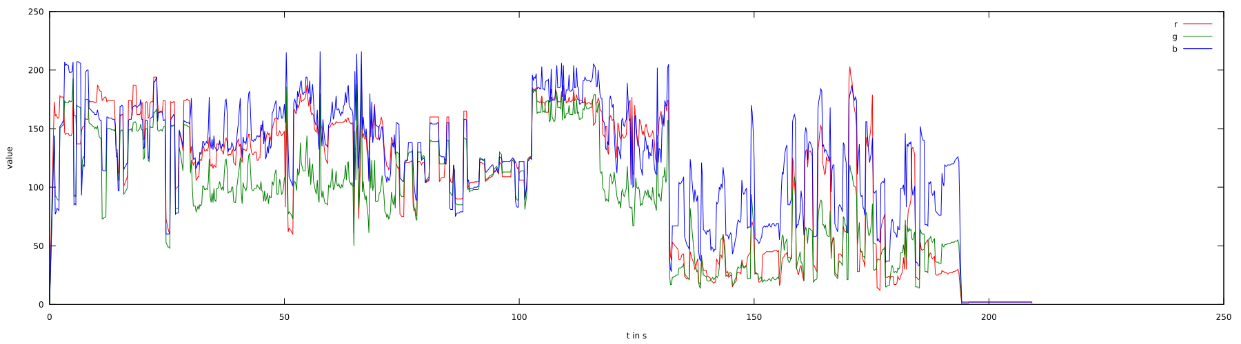 Dirk D. schrieb: > was ich gemacht habe: > mit ffmpeg 1x1 pixel-bilder erzeugt: > > ffmpeg -i <meinlieblingsfilm.mp4> -vf scale=1:1 frame%08d.png > > und alle bilder der reihe nach per script geöffnet, den farbwert von > position 0,0 ausgelesen und für R G und B in der Reihenfolge 3 Byte in > eine Datei geschrieben. Das habe ich mal nachgebaut und mit zwei möglichst schrecklichen Beispielen in RGB und HLS (letzteres ohne Gewähr) geplottet: https://www.youtube.com/watch?v=4JipHEz53sU Bilder mit 4J... https://www.youtube.com/watch?v=MeWkXPAtayQ Bilder mit MeW... Muster und besonders die erwähnten Sprünge bei Schnitten sind erkennbar.