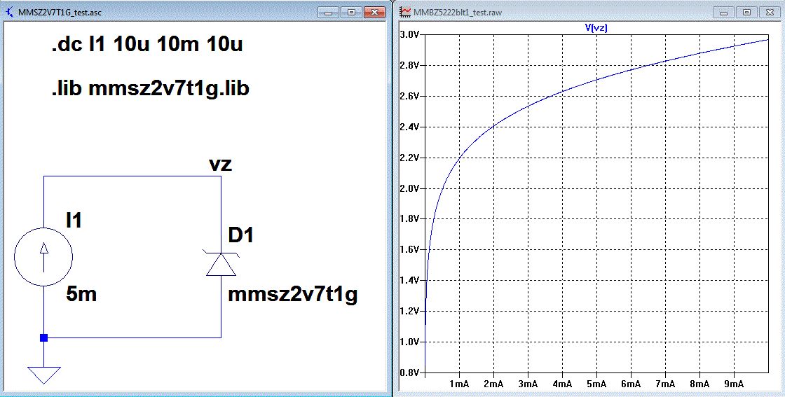 Hallo Tim, Ich habe dir mal ein Beispiel mit der MMSZ2V7T1G von Onsemi gemacht. Die haben ein PSPICE Modell auf deren Webseite. Die Z-Dioden mit kleiner Spannung haben wirklich so einen weichen "Knick". Achtung, das Modell ist ein Subcircuit. 1. Diode im Schaltplan plazieren. Ctrl plus rechte Maustaste das Symbol im Schaltplan Prefix D ändern nach Prefix X OK 2. .inc modelfilename oder .lib modellfilename als SPICE-Directive in den Schaltplan legen. 3. Die Modelldatei in den Ornder des Schaltplanes kopieren. Gruß Helmut