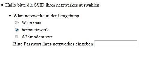 Hallo ich bin etwas in einer Sackgasse und hoffe hier etwas Hilfe zu finden ;) Ich hab mir einen nodemcu amica V2 https://upload.wikimedia.org/wikipedia/commons/c/c6/NodeMCU_DEVKIT_1.0_BOTTOM.JPG http://g02.a.alicdn.com/kf/HTB1zyunIVXXXXaZaFXXq6xXFXXX4/Official-original-only-V2-not-V3-Esp8266-NodeMCU-v2-Lua-WIFI-network-development-kit-board-based.jpg gekauft und was soll ich sagen klappt alles wunderbar aber.... jetzt hatten mich welche gefragt, ob ich ihnen auch solche einstellen und geben kann. Das mit Hardware klappt ja, aber bei Netzwerk nicht. Ich wollte in der init.lua zwei Verweise drin haben für den Webserver, nur beispielhaft, weil ich nicht weis ,ob das überhaubt geht. Die Eins steht dafür das es aktiv ist. ____________________________________________________________________ init.lua A=1 B=0 A=wifi.AP = index.html B=wifi.client =index2.html das ganze sollte dann über html zu anderen gehen ______________________________________________________________________ _ index.jpg zeigt was er beim ersten mal als access point zeigen soll. Wenn er im homenetywerk ist dann, soll er immer von da an als Wifi client laden und die index2.html aufrufen und nehmen. ______________________________________________________________________ Vielen dank schon mal fürs lesen