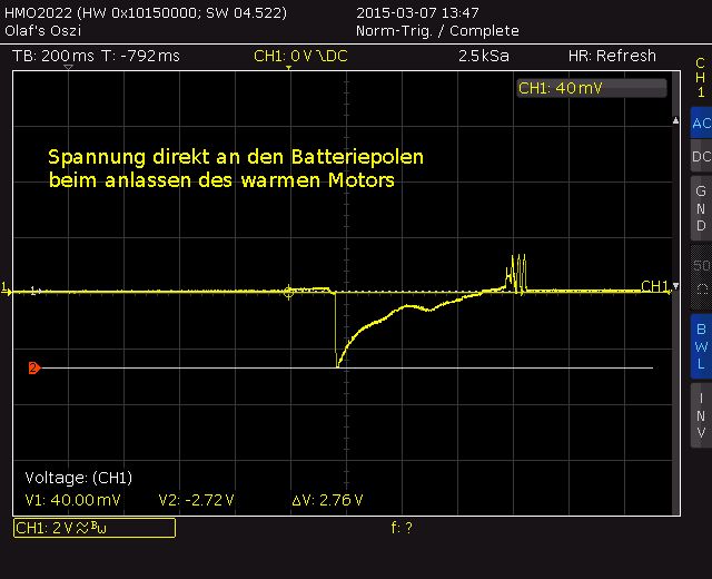 > Ich frage mich, auf welcher Grundlage dann der (hilfsweise/ersatzweise) > bereitzustellende Energiebedarf zum (sicheren) Anlassen eigentlich > ermittelt werden können soll. Fuer den Energiebedarf zum anlassen habe ich ja schonmal eine realistischen Bauchwert ausgerechnet. :-) Es nuetzt nur nichts. Diese relativ kleine Energiemenge ist auch bereits in einem als leer erachteten Akkus noch enthalten. Es ist aber auch eine gewisse Spannung und eine kleiner Innenwiderstand notwendig damit der Anlasser diese Energie entnehmen kann. Damit eine leere Batterie das liefern kann muss sie vorher mit einer sehr grossen Energiemenge geladen werden. Es ist daher wesentlich zielfuehrender aus dem bereits ziemlich leeren Akku noch ein kleines bisschen weitere Energie zu entnehmen und damit einen Kondensator auf eine hoehere Spannungslage zu bringen. > Natürlich kann man "Herumprobieren". > Messungen sind aber einfacher und zielführender. :D Aber relativ aufwendig. Ich haenge mal drei Bilder an die ich an meinem V70 gemessen habe. Beim V70 ist die (neue! 100Ah) Batterie hinten im Kofferraum. Ihr seht, ohne Oszi kann man KEINE Aussage machen. Messungen mit dem Multimeter sind unsinn. Ausserdem sollte man natuerlich den Strom messen koennen. Weil ich das nicht konnte, sieht man auf den Bildern nur die Spannung. Aber trotzdem interessant oder? > Ich bezweifele auch, das man ein Auto größer 100PS anschieben kann. Weil du nicht genug Muskeln hast? :-) Ich hab schonmal meinen XM mit 168PS angeschoben. War nicht einfach, aber ging. > Bei warmen Motor zog der Startermotor bei meinem 1982 Honda 1.6l Motor > nur 20A. Wie gemessen? Natuerlich zieht so ein kleiner 80PS Motor aus dem Accord/Prelude im warmen Zustand wenig Strom, vor allem weil der auch noch ein Getriebe im Anlasser hatte. Aber wenn es in den ersten 100ms doch 100A sind und die Spannung dann soweit zusammenbricht das der Microcontroller im Steuergeraet abstuerzt dann springt ein auto auch nicht hat. Das Problem hatte ich mal an meinem XM. (war ein schlechter Kontakt am Massekabel. Olaf p.s: Den alten Prelude haette ich gerne nochmal. War eine tolle Kiste.