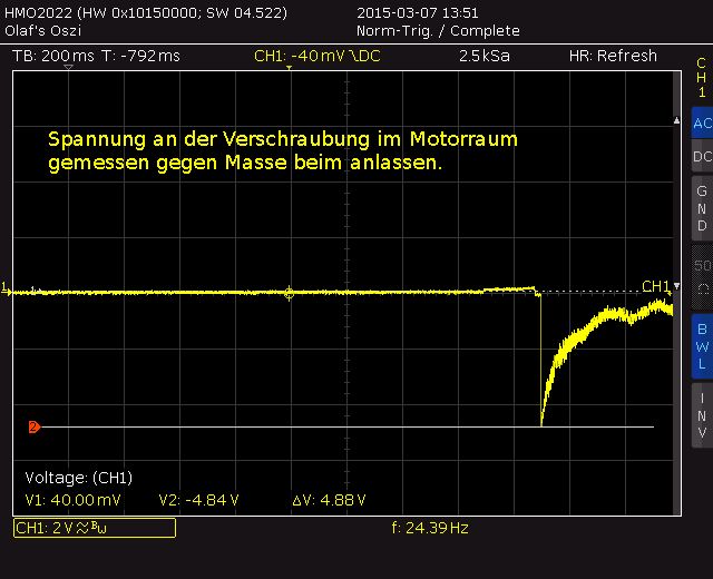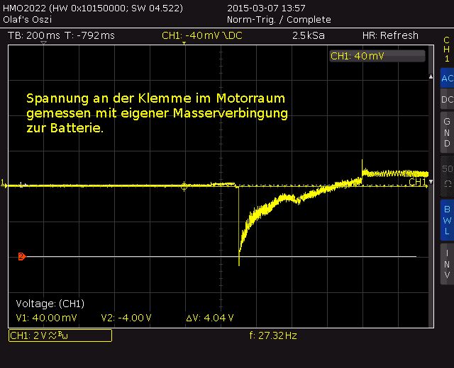 > Auch die Vorglühung hat (jeweils) einen gewissen Energiebedarf. > Der aber nur sehr kurzfristig hoch angesiedelt ist! > Ganz im Gegensatz zum Anlasserbetrieb. :D Du laberst gerade erstaunlichen Unsinn. Wirf mal einen Blick auf die drei Bilder die ich von meiner Bordspannung beim anlassen gepostet habe. Du kannst dort den erheblichen Spannungseinbruch sehen der entsteht wenn der Anlasser zuschaltet. Du kannst sehen das spaetestens nach 100ms die Spannung wieder deutlich angestiegen ist. Der Grund durfte sein das der zu Anfang sehr hohe Strom DEUTLICH abgenommen hat weil die Schwungmasse im Motor sich jetzt bewegt und nicht mehr weiter beschleunigt werden muss. Ausserdem kannst du sehen das nach 700ms die Bordspannung deutlich ueber die Batteriespannung ansteigt weil jetzt der Motor laeuft und die Lichtmaschine bereits Energie liefert. Mit anderen Worden nach 0.7s ist der Anlasser unnoetig und es kommt bereits Energie aus der Lichtmaschine. Sicher das ist jetzt der Idealfall bei warmen Motor. Aber trotzdem eine erstaunlich kurze Zeit. Denkt man so garnicht oder? GLuehkerzen dagegen ziehen sicher ueber viele Sekunden Energie. Ich glaube sogar die werden vom Steuergeraet bereits aktiviert wenn du nur die Tuer deines Autos aufschliesst damit die Leute nichts mehr die Rudolf Diesel Gedenkminute erleben wie es sie frueher mal gab. Da wird sicher das 10-100fache an Energie reinfliessen wie fuer den Anlasser. Die Zeit ist hier der alles dominierende Faktor. Das aendert sich erst wenn man eine abgeranzte Dreckskiste hat wo man lange orgeln muss bis sie anspringt. Aber Defekte sollte man halt reparieren und nicht akzeptieren. Olaf