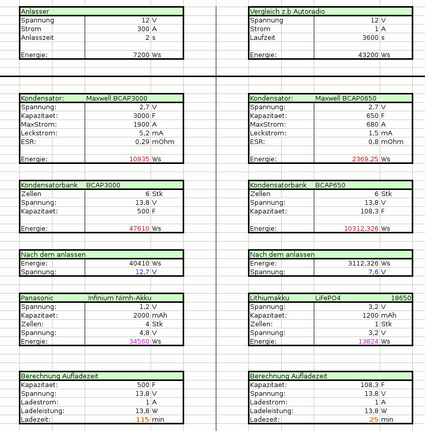 Ich habs gerade mal ueberschlagmaessig berechnet. Dabei habe ich ein paar Vereinfachungen vorgenommen. Ich gehe z.B davon aus das der Anlasser nur 2s laeuft. Das ist sicherlich realistisch bei einem Motor der gut anspringt. Andererseits koennte es auch mal laenger dauern. Allerdings gehe ich auch davon aus das der Anlasser dauernd 300A zieht. Das macht er zwar, aber nur in den ersten 100-200ms. Danach sinkt der Strom deutlich ab. In der Realitaet ist das ganze sogar noch komplizierter weil man bei den hohen Stroemen auch deutliche Spannungsverluste in den Zuleitungen haette. Aber im Prinzip koennte man eine vollkommen leere Kondensatorbank aus 6Stk 650F Kondensatoren mit 3-4 AAA-Akkus aufladen und damit einen Motor anlassen. Das Problem ist nur das man etwa eine halbe Stunde warten muesste. Man sieht auch das man bei einem groesseren Kondensator den Nachteil haette das man laenger warten muesste bis man eine akzeptable Spannung haette. Und da liegt auch genau das Problem mit dem aufladen einer leeren Autobatterie. Wenn die z.B auf 7V entladen waere, also ziemlich leer, dann dauert es einfach viel zu lange sie wieder auf 12V zu bekommen. Das schaffen ein paar Mignonakkus dann nicht mehr. Ausserdem hat eine reine Kondensatorloesung das Problem das sie nicht sehr lange Kleinverbraucher betreiben koennte. (vgl: Autoradio, Warnblinker) Interessant koennten aber Sonderanwendungen sein. Eine Kombination aus kleinem Bleiakku mit Kondensatorbank. Ist aber sicherlich teurer wie ein normaler Akku. Deshalb gibt es das bisher nur fuer LKWs. Aber wenn der Weg das Ziel ist dann sollte man sich sowas basteln koennen. :-) Olaf