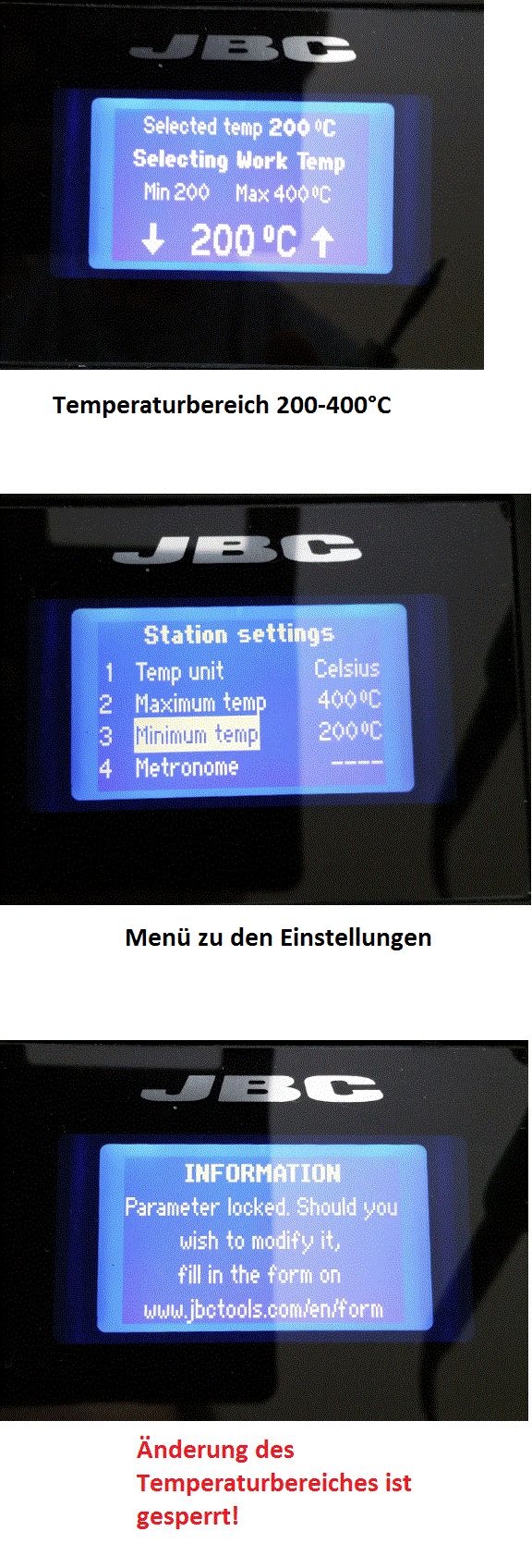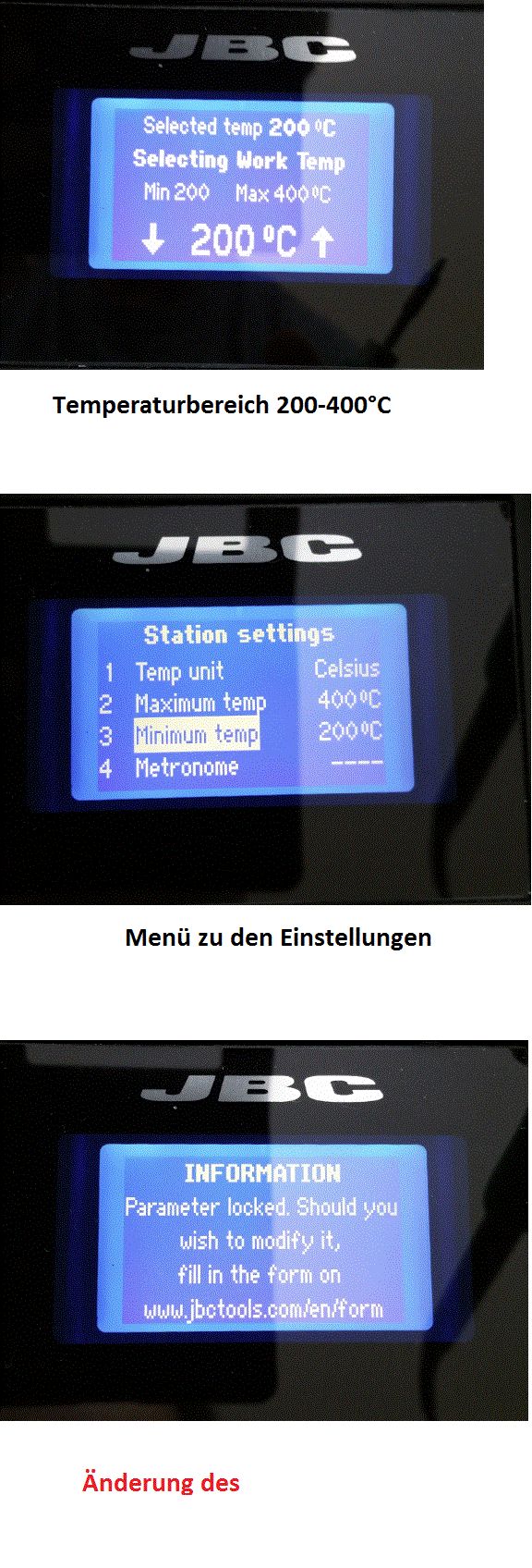 Hallo Micro C., > Nein, geht leider nicht. > Bitte Bild im Anhang betrachten! Das ist ja doof, bei meiner Station (CD 2C020) ist das problemlos möglich. Vielleicht solltest du mal JBC unter dem angegebenen Link kontaktieren. Gruß rhf
