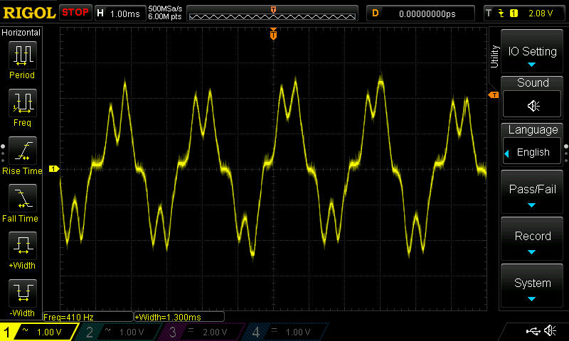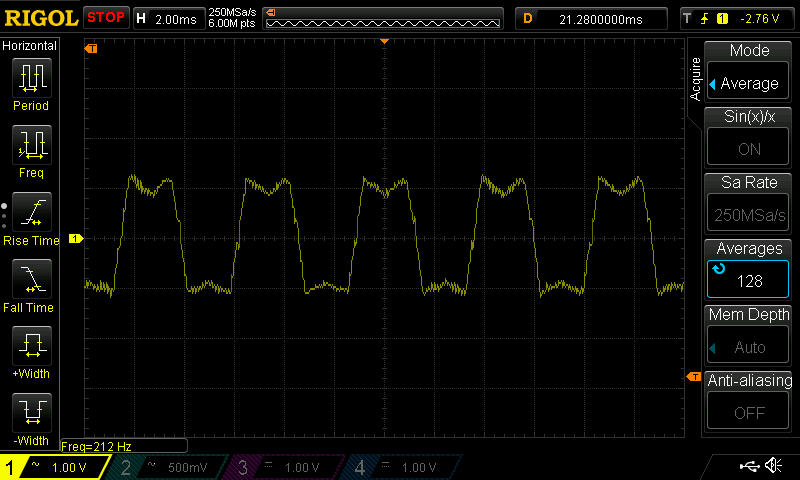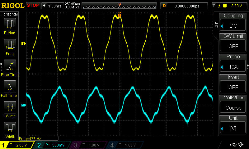 alles klar, anbei die Aufnahme der Motorspannung unbelastet, wieder angetrieben mit Bohrmaschine. Danke für eure Hilfe, bin grad dabei die gemittelte Spannung direkt aus der PWM Stufe zu untersuchen.