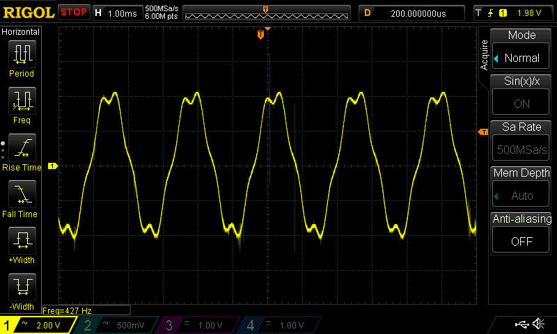 Hallo Leute, ich hoffe es kennt sich einer von euch gut mit diesem Sachverhalt aus, ich bin gerade dabei das SVPWM Modul für eine Motorsteuerung zu designen. - Eingangsgrößen sind alpha und betha Werte aus dem Koordinatensystem, Wertebereich ist von -250 -- +250 für den jeweiligen Wert. - Das Modul berechnet nun Sektor, Betrag und die jeweiligen Dutys... Mein einziges Problem ist der Strom durch den BLDC Testmotor, in angehängter Grafik erkennt man deutlich die 3. Harmonische, die aber laut Literatur nur als Spannung anliegen soll, der Strom soll ja Sinusförmig sein, ist er leider nicht... Die Grafik zeigt den Motorstrom einer Phase bei halber maximaler Drehfrequenz. Motor befindet sich im Leerlauf. Was noch zu erwähnen wäre ist, dass wenn ich das Feld abreisen lasse, der Strom fast perfekt Sinusförmig ist. Anscheinend entstehen die Einbrüche durch die Gegeninduktion der Permanentmagneten, kann das möglich sein? Danke im voraus ;)