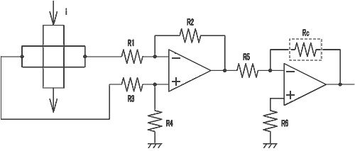 >Diese Art von modifizierter Stromquelle nennt man normalerweise >Spannungsquelle, d.h. du könntest dann gleich das Hall-Element an eine >feste Spannung hängen. Und nein: das wäre nicht sinnvoll, das würde den >Temperaturgang deiner Magnetfeldmessung deutlich verschlechtern statt >ihn zu verbessern. Ok, das macht Sinn, danke! >Der Tempco deines Hall-Elements ist mit -0,06%/°C angegeben. Willst du >das wirklich verbessern oder geht es um akademisches Rumgespiele? >wieso bist du so ehrgeizig und möchtest den Temperaturgang kompensieren, >wenn die Linarität des Sensors um Zehnerpotenzen schlechter ist, d.h >eine winzige Feldänderung genügt um ...usw. In der Tat steht die Kompensation im Mittelpunkt, also trifft Achim's Begriff 'akademisches Rumgespiele' das Ganze sehr gut ;) Diese Methoden zur Kompensation machen in der Tat Sinn, allerdings soll ich das Ganze in einer OPV-Schaltung realisieren, wodurch sie für mich unbrauchbar wären! Bei folgender Schaltung wird der Drift des Sensor mit einem PTC (hier Rc) gemacht. So in der Art wollte ich das realisieren. Dazu brauche ich dann nur noch die Offsetkomp. und die Kompensations des B-Feld-Drifts.