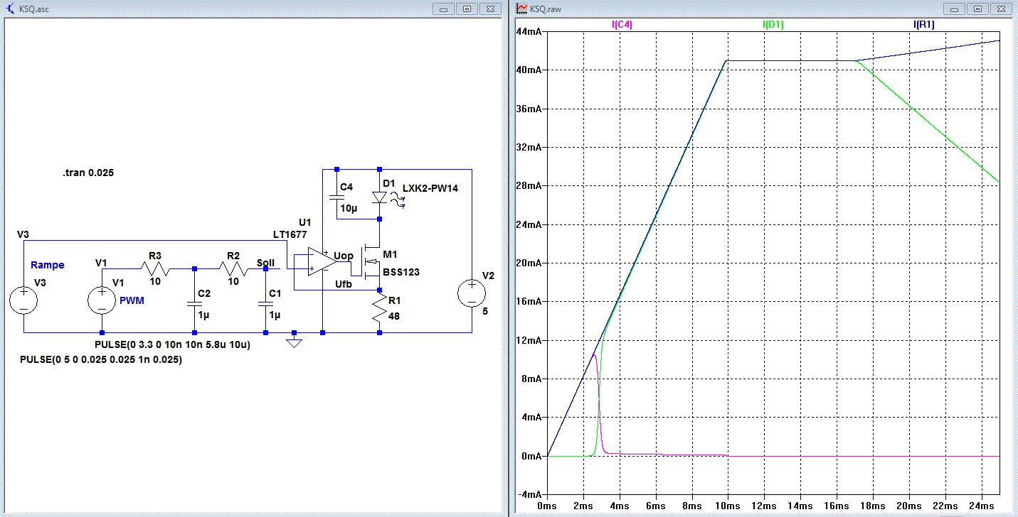 Wie kann man sich den steilen Anstieg des Stroms der KSQ (im grünen Graphen) bei ca. 2,8 ms erklären? Die einzelnen Graphen stellen dar: Hellblau (Vfb): Spannung über dem Source-Widerstand Türkis (Uop): Ausgabespannung des Opamp Rot (V3): Rampe als Sollwertvorgabe Grün (D1): Strom durch die LED (Was ab ca. 9 ms beginnt, ist durch die zu niedrige Versorgungsspannung zu erklären. Wenn man die auf 9V erhöht, ist der Spuk weg.)
