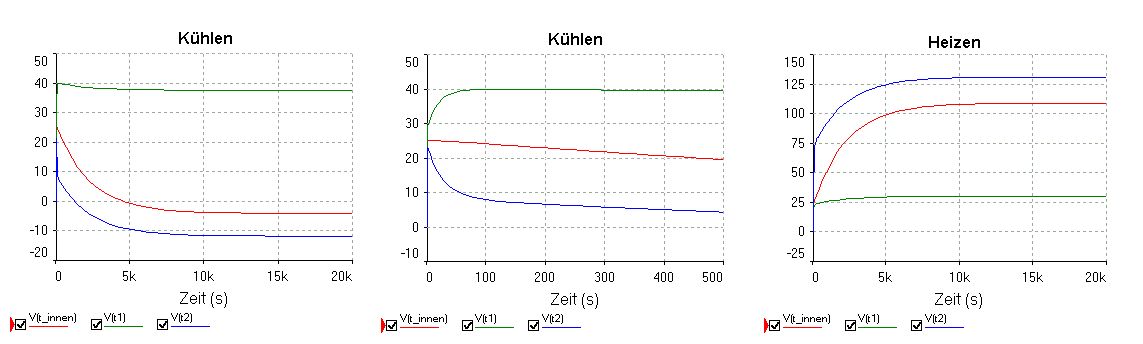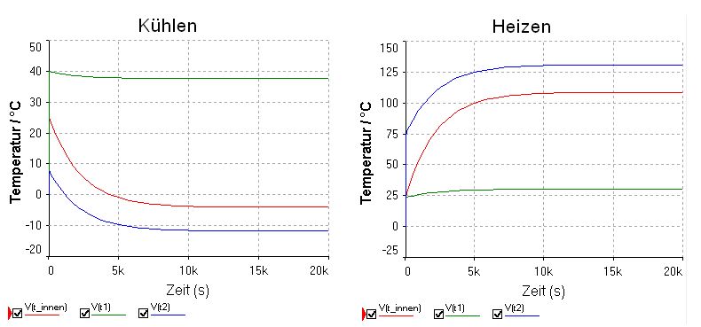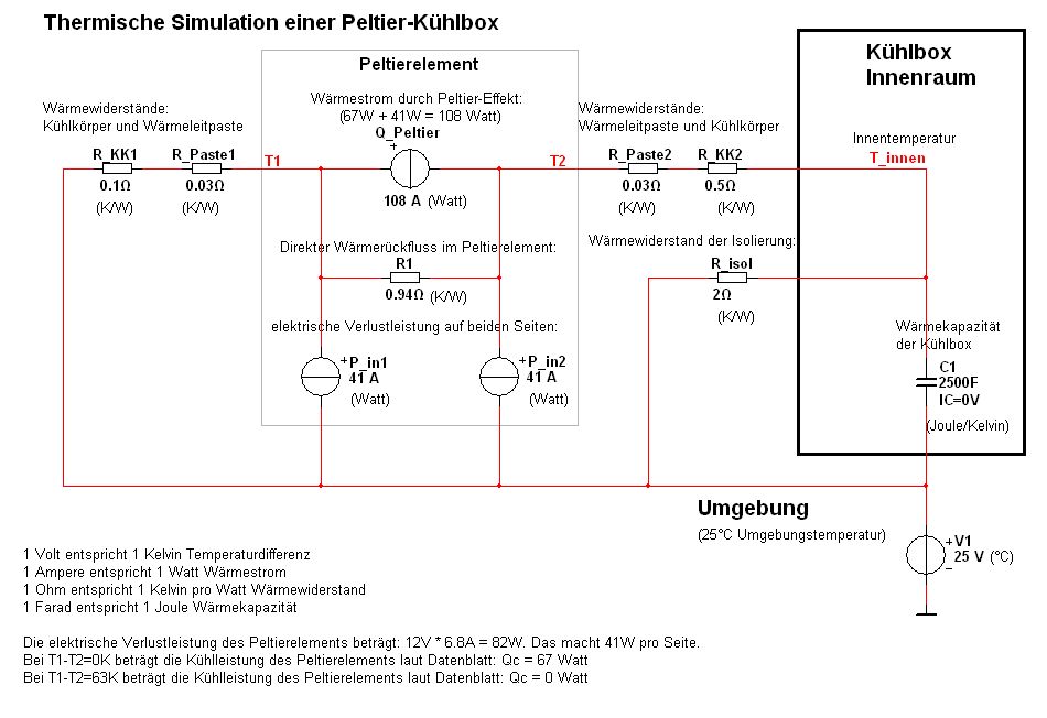 Ich hatte eine käufliche Kühlbox (4x4 cm Element) über 5 Stunden mit 1 Liter Wasser als Last betrieben (Akku am Ladegerät als Stromquelle). Die Wassertemperatur ging nicht unter 12 °C. Vermutlich ist die Boxisolierung zu schlecht und der Wärmeübergang am Kühler zu klein, die Abluft war handwarm. Warscheinlich braucht man 2 oder 3 Elemente, um tiefer zu kommen. Der Simulationsansatz ist interessant, aber warscheinlich sind die Widerstände zu optimistisch. Mein Ansatz war ähnlich, mit Temperatur als Spannung, dem Wärmedurchgang als Widerstand, dem Wärmestrom als Strom und der Wärmekapazität als Kondensator. Die Werte muß man sich zusammenklauben, die Flächen, die Dicken und die Temperatur sind meßbar. Die schöne "Ausarbeitung" in Calc ist mir leider zusammen mit der Harddisk verstorben, natürlich 1 Tag vor dem wöchentlichen Backup... Hatte bisher keine Lust auf Neuanfertigung. Gruß - Werner