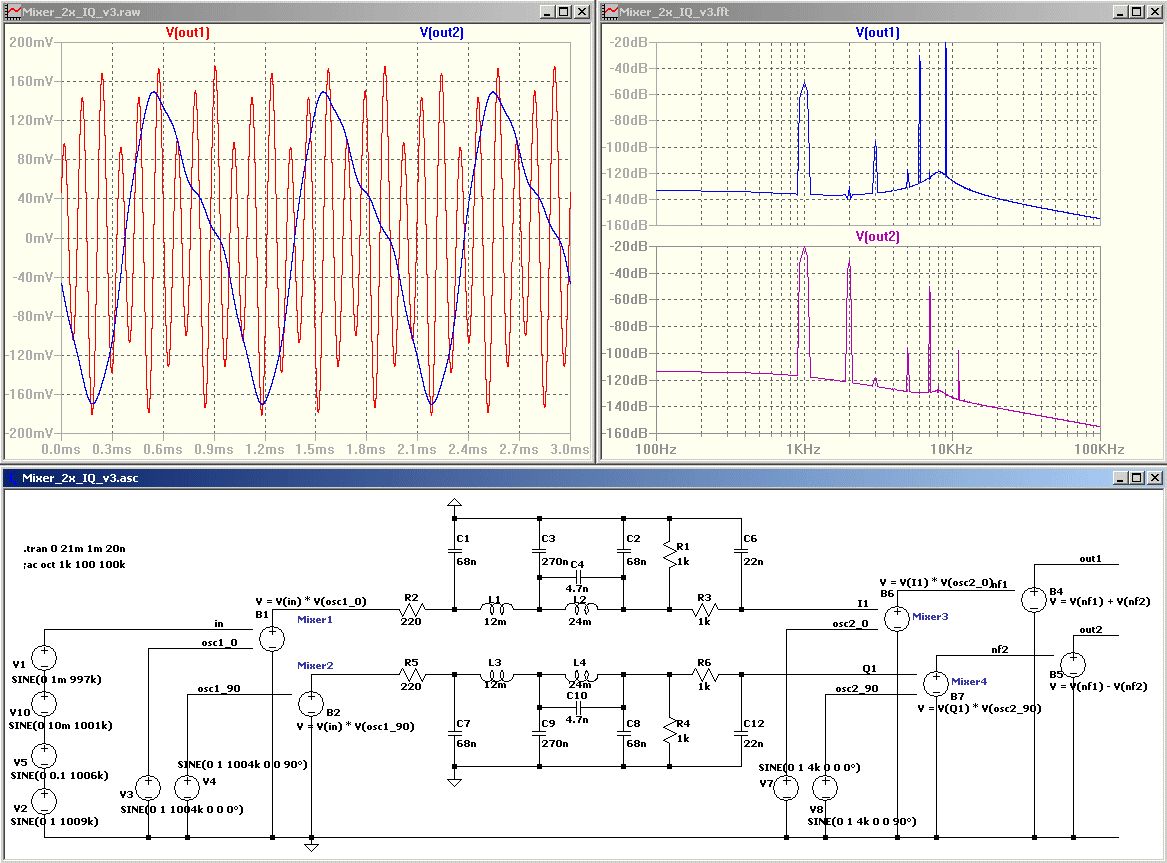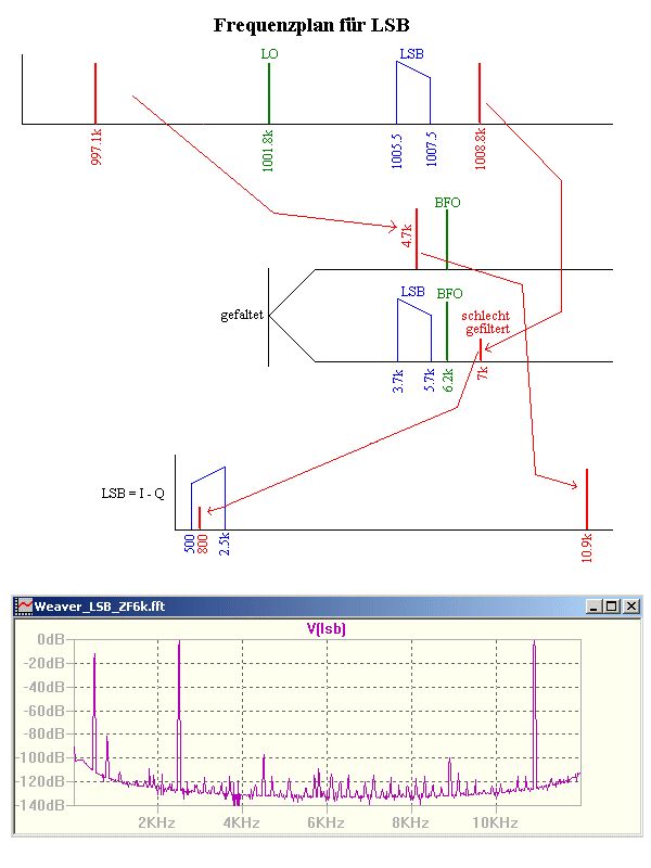 Meiner Meinung nach beweist der angehängte Plan, dass die Seitenbandunterdrückung funktioniert. Sonst würde das gefaltete 4,7 kHz Signal später bei 1,5 kHz im Hörbereich auftauchen. In welchem Maße durch die zweite Mischung zusätzliches Rauschen verursacht wird, kann ich so schwer beurteilen. Es wird ja nicht auf Null und dann wieder hochgemischt, sondern der Weg führt über eine ZF bei 3...6 kHz. Es stellt sich auch die Frage, ob die herkömmliche Methode mit Hilbert-Transformation diese Probleme garantiert nicht hat. Immerhin wird dort per Hardware in die Nähe von Null gemischt und das 1/f Rauschen des OPVs und des ADCs spielt eine Rolle. Quantisierungsrauschen durch Zeit- und Amplitudenfehler können durch eine ausreichende Samplerate und Auflösung vermieden werden. Gruß, Bernd