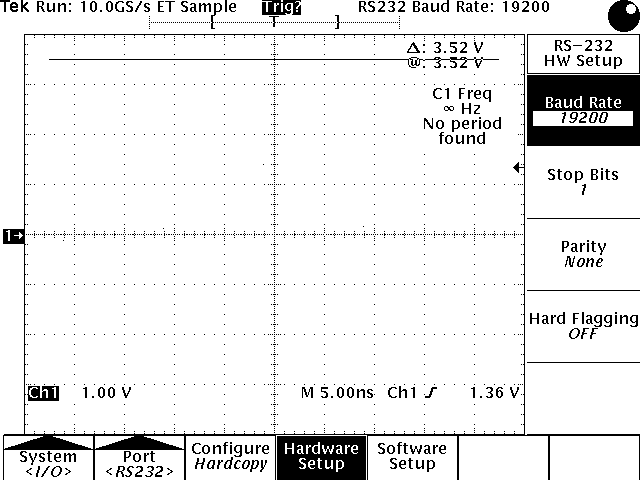 Bei mir functioniert es mit Hterm, Einstellung 19200 baud (gibts ein Menu auf den Scope wo man dieBaudrate einstellen kan, under Utility). Ich habe ein TDS420A Scope. Zum downloaden habe ich das Format geandert nach PNG, aber es war ein bmp.