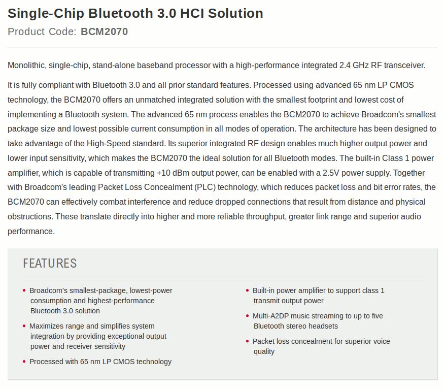 Hallo, hätte 9x solcher Platinen mit besagtem Broadcom BCM2070 über. NEU/Unbenutzt. Ich habe bei einer kurzen Suche zwei Datenblätter gefunden, aber das eigentliche nicht. Wer Zugang zu Broadcom hat bzw. einen Account, kann ja vielleicht dort mal suchen. Da die Informationen widersprüchlich sind, weiß ich nicht ob das jetzt die Bluetooh 2.1 oder 3 Version ist. Falls jemand diese Platinen brauchen kann, bitte um eine Nachricht hier oder per PN. Preislich, würde ich mal 2€ pro Platine vorschlagen. zzgl. Versand mit der Deutschen Post.