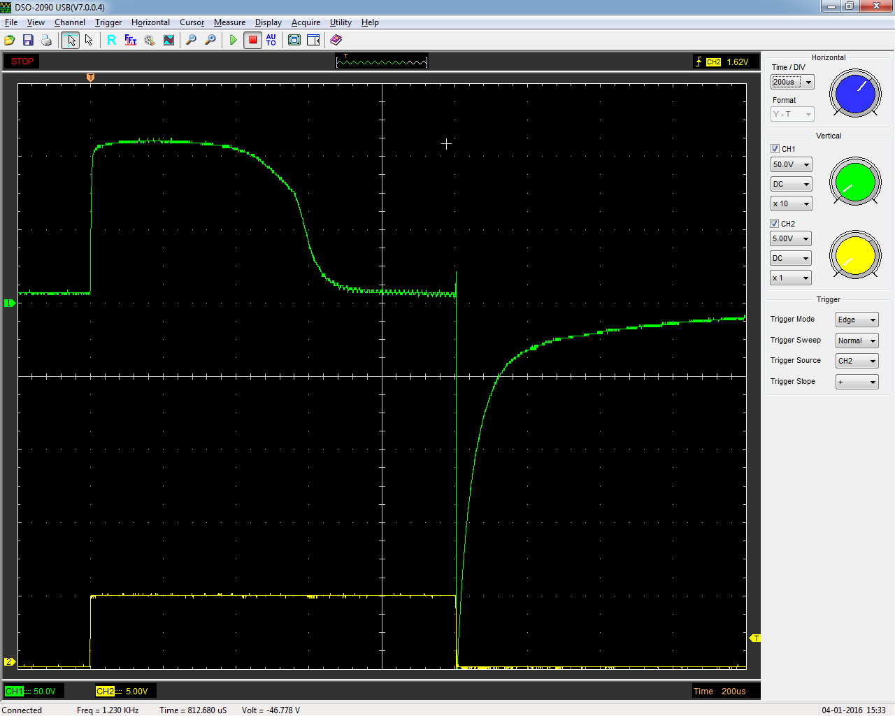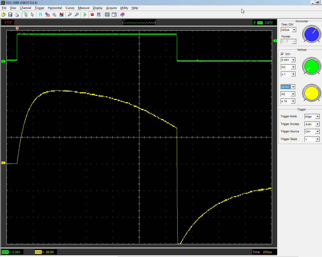 So, ich habe nun mal andere Trafos duchgemessen. Das ist ein SV1-505 und wurde ebenso mit 1k abgeschlossen und ein 12V Impuls drauf gegeben. Die Scope Kanäle sind getauscht. Die gewünschten Pulse sind max 250us - also da baut dieser Trafo grade so seinen maximalen Strom auf :( Habt ihr noch eine Idee was man probieren kann?
