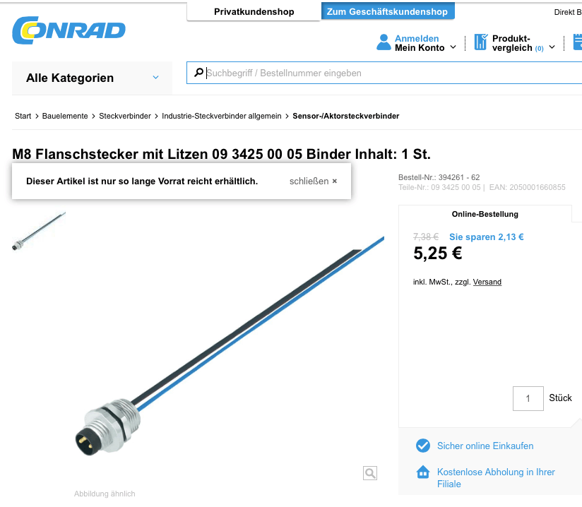 Ich sehe gerade, dass es die 5-polige Version ist. Die scheint wohl nicht mehr lange erhältlich zu sein (s. Bild) Und die 8-polige Version ist deutlich teurer. http://www.voelkner.de/products/431459/Binder-M8-Flanschstecker-mit-Litzen-09-3427-00-08-Inhalt-1-St..html
