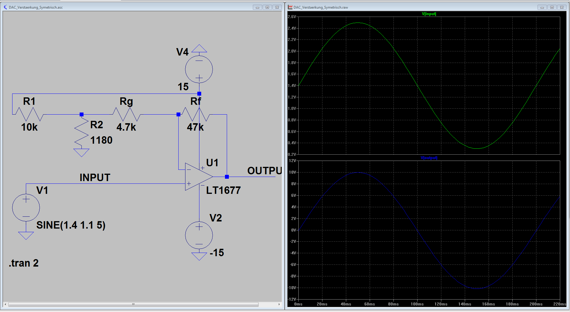 Hallo, ich habe an meinem µC XMC4500 einen DAC-Ausgang, der mir eine analoge Ausgangsspannung zwischen 0,3V und 2,5V liefert. Damit soll analog ein Umrichter angesteuert werden, der einen analogen Eingang im Bereich von +-10V hat. Ich habe mir eine OP-Schaltung überlegt (siehe Anhang), mit dieser dies realisiert werden kann. Jedoch ist mir die Symetrierung zu ungenau, da sie durch die nicht genaue Bestimmung der Widerstände (E-Reihe) leicht Offsetbehaftet ist. Wisst Ihr hier eine lösung wie man das 100% Symetrisch bekommt? Warum ich das so genau haben will? Damit werden zwei Motoren angetrieben. Um den Bewegungsablauf auszuführen muss ein Motor vorwärts und der ander SYNCHRON dazu rückwärts drehen. die kleinste abweichung bei der Ansteurung bringt mir mit dem darauffolgenden Regelungsverfahren nur Ärger und keine saubere Bewegung.