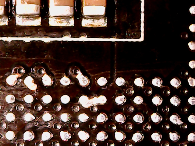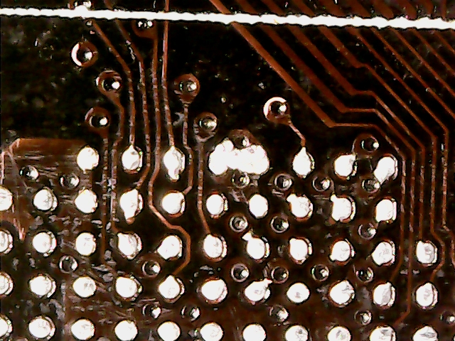 Senfgurke schrieb: > Flip B. schrieb: >> die müssen verbunden sein. du hast nur den lötstop vom kupfer >> gerubbelt. > > Das klingt interessant ... wieso ist das so sicher? Sicher ist es nicht, aber wahrscheinlich. Gucke doch mal im Datenblatt des runtergelöteten ICs nach, ob diese Pins die gleiche Funktion haben (VCC oder GND oder ähnlich). Ohne intakten Stopplack wird es allerdings schwierig werden, den BGA wieder aufzulöten... Tip: Mit dem Solderwick niemals über die Platine "schrubben". Nur auflegen, und von oben mit dem Kolben Hitze draufgeben, bis das Zinn aufgesaugt wird. Und nicht zu lange draufbraten.