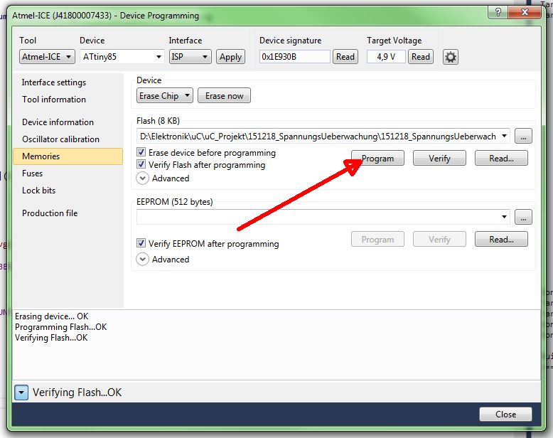 Hallo zusammen! Ich suche nach einer Bedienungs-Abkürzung, wenn ich im AtmelStudio 7.0 das compilierte Prog auf den uC übertragen möchte - gerade bei Fehleranalyse, eher häufiger. Der mir bekannten Weg nach Compilierung; 0. F7 ... Compilieren 1. [Strg]+[Shift]+[P] 2. [Apply] 3. [Memories] 4. [Program] ... 5. [Close] Gibt es eine direkten ShortCut um direkt nach Punkt 0, den Punkt 4 zu aktivieren? Optimal wäre ein SchortCut, er alles auslöst, ohne das "Divice Programming"-Fenster zu öffnen.