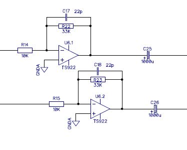 Also, ich hab' auch mal einen Kopfhörer(verteil)-Verstärker mit Opamps zusammengebaut. Der sollte über USB versorgt werden, aus den 5V habe ich mit einem LM2577-12 erst 12V gemacht und die dann mit einem Spannungsteiler von 2x 220 Ohm und 2x 2200µF Pufferelkos zu +/-6V mit virtueller Masse umgestrickt. Nicht audiophil, aber es funktioniert prima. Die Eingangsstufen sind NE5532 mit einer Verstärkung von 1 (5532 sind unity-gain-stable, 5534 IIRC NICHT), als Eingangs-Kondensatoren habe ich 1µF Folienkondensatoren genommen (etwas überdimensioniert, hatte ich aber da). Dann kommen 10K-Potis als Lautstärkesteller. Die Ausgangsstufen sind TS922 mit einer Verstärkung von 3,3 (33K : 10K), Ausgangskondensatoren sind 1000µ Elkos (680µ hätten auch gut gereicht, waren aber weder kleiner noch billiger...). Funktioniert mit 32 Ohm - Kopfhörern problemlos, gibt beim Filme schauen in der Ferienwohnung ausreichend Knallbumm ohne die Nachbarn aus dem Bett zu werfen und für meinen Geschmack ist der Klang auch durchaus ordentlich. Nur mal als Alternativ-Vorschlag.