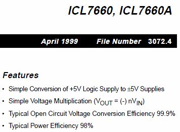 O Mann, Hermann, mir rollte es gerade die Fußnägel auf, als ich gesehen habe, was das Intersil-Marketing da geschrieben hatte. :) Wie kann der Wirkungsgrad im Leerlauf 99,9% sein? Der Wirkungsgrad im Leerlauf ist 0%. Zum Glück ist dann der korrekte Zusammenhang auf Seite 5ff., erkennbar: http://www.intersil.com/content/dam/Intersil/documents/icl7/icl7660.pdf Das Maxim Datenblatt gibt das auch sauber wieder: http://datasheets.maximintegrated.com/en/ds/ICL7660-MAX1044.pdf Seite 3, Efficiency.