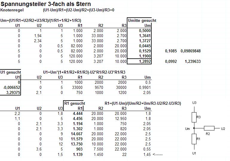 Ich habe mir für alle häufigen Aufgabenstellungen eine Excel-Tabelle gebaut. Dort brauch ich dann nur die gewünschten Werte einzutragen. Ich habe das für dich mal gemacht. Die Widerstände haben bei mir andere Bezeichnungen. Die Lösung ist nicht eindeutig - den Wert für R3 muss man frei wählen - aber so, dass für den gesuchten R1 nichts negatives heraus kommt. Im Anhang ist deine Aufgabe als letztes Beispiel unter "R1 gesucht" eingetragen.