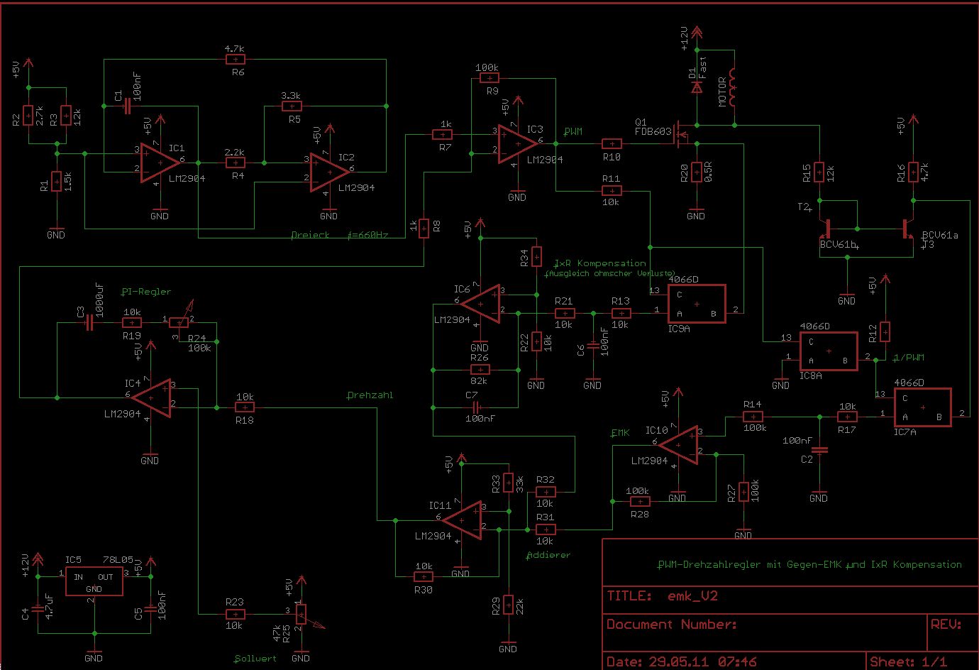 Hier mal der etwas komplexere Ansatz. Hab ich vor ein paar Jahren mal aufgebaut weil mich das Prinzip interessiert hat. Ausserdem versteht man so ganz gut warum man das heute gerne in Software macht. :) An R25 sollte man eine Spannung fuer die gewuenschte Drehzahl einspeisen koennen. Olaf