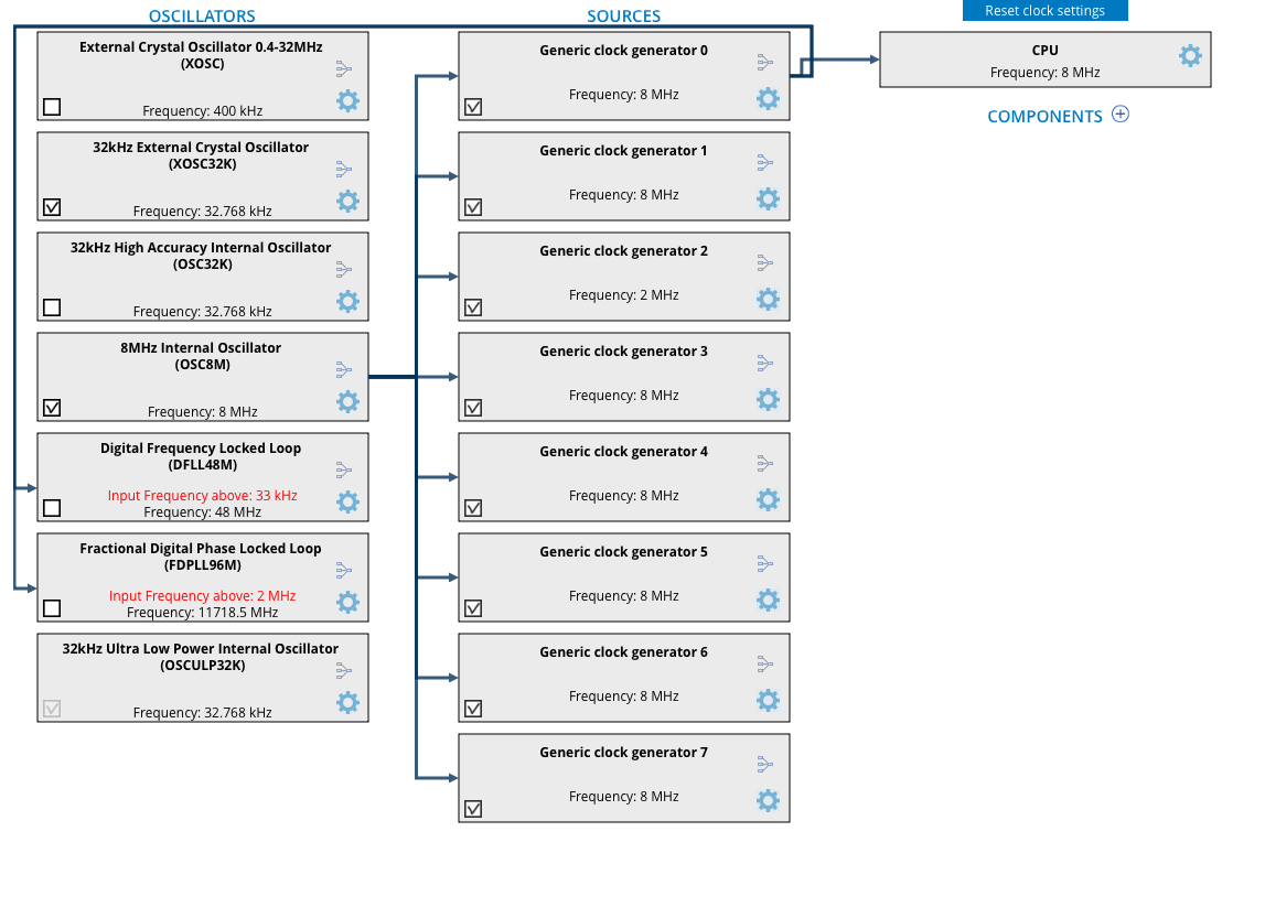 Hallo, Ich möchte mir mit ATMEL Start ein Template für mein ATSAMD21G18 Board machen, jedoch habe ich ein paar (Verständnis) Probleme mit der Takterzeugung. Als "Vorlage" nutze ich einen Arduino M0, dieser läuft mit 48Mhz. Bei Atmel Start bekomme ich ihn jedoch nicht über 8MhZ. Gibt es dort irgendwo einen Clock Multiplier von 6? Wenn ja, wo? Bisher habe ich nur die divider gefunden. So sieht es Momentan bei mir aus (siehe Anhang). Ich nehme mal an es läuft über das Digital Frequency locked loop (?), aber woher kommt dessen Taktfrequenz?