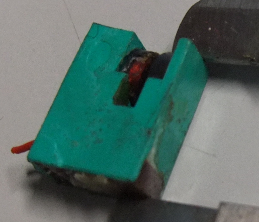 Im Photo abgebildeten Sensor habe ich aus einem zu rettenden Durchflussmesser herausoperiert. Es handelt sich um einen induktive Gabelsensor bei welchem die beiden Schaltenkerne deutlich zu erkennen sind. Zwei Anschlüsse rt/sw mit relativ simpler nachfolgender Schaltung. 6 pin DIL IC leider nicht mehr lesbar. Lesbar ist noch ein Siemens Logo und der erste Buchstabe mit viel Fantasie vielleich ein T, also vermutlich eine TAA 861 oder so (zumal die Frequenzkompensation auf pin 6 nicht angeschlossen ist). Der Ausgang geht auf einen 555er, aber so genau habe ich mir die Schaltung noch nicht angesehen weil der Sensor hochohmig ist und nicht mehr funktioniert. Bedämpft wird mit einem Aluplättchen, Frequenz schätzungsweise 10 Hz bis 1khz. Vermutlich hat das Teil eine eigene eingegossene Elektronik (Oszillator). Die Vergussmasse ist unten erkennbar. Farbe riecht verdammt nach Pepperl und Fuchs, aber alle Teile die ich dort finden konnte sind leider viel größer. In Richtung der abgebildeten Schieblehre hat das Teil 15mm, die Höhe ist 6mm und in Kabelrichtung 12mm. Das Teil war eingeklebt, weshalb es jetzt etwas rampuniert ist. Ich vermute dass die Vergußmasse nicht dicht gehalten hat und Wasser eingedrungen ist was dann zum Ausfall geführt hat. Äquivalente Abmessung und Funktionsprinzip wären auch ok