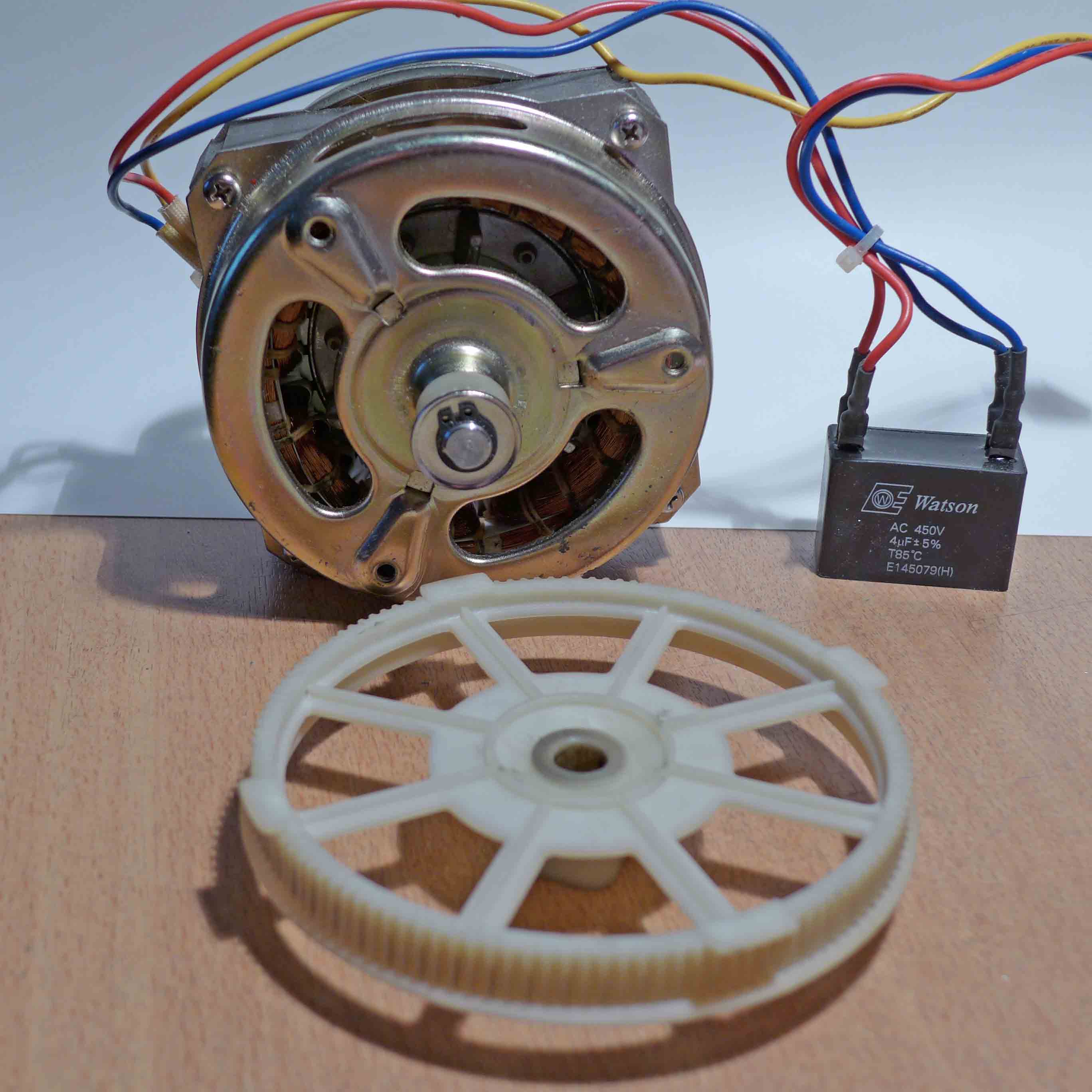 Von aussen ist schon an der Wicklung zu erkennen, das es ein Mehrphasenmotor ist. Das es ein Asynchronmotor (Kurzschlussläufer) sein muss, ergibt sich daraus, das er beim Drehen, keine nennenswerte Spannung abgibt. Also bleiben nur noch 2 Möglichkeiten: Auf der Leiterplatte war ein (drehstrom) Wechselrichter, oder die wahrscheinlichste Variante - https://de.wikipedia.org/wiki/Kondensatormotor Jetz wäre noch zu klären, wie die beiden Wicklungen liegen. Das lässt sich mit 2 Widerstandsmessungen klären, wobei auch erkennbar ist, ob beide Wicklungen gleich sind, oder es eine Haupt- und eine Hilfswicklung (hochohmiger) gibt. Die grösste Herausforderung ist jetzt noch, die Größe des erforderlichen Kondensators. Da diese aber immer ein Kompromiss für die jeweilige Lastsituation ist, wäre etwas Probieren erforderlich. Idealerweise vergleicht man mit dem Oszi (Achtung: Netztrennung!), die Spannung über den Wicklungen, bei annähernd der zu erwartenden Last. Phasenverschiebung sollte 90° sein. Ist sie zu klein, ist der Kondensator zu groß und umgekehrt. Aber wie gesagt, auch in der Originaldimensionierung wird es ein Kompromiss sein, da die Belastung des Motors im Brotbackautomaten auch nicht konstant gewesen sein dürfte. Würde etwa eine Drehzahl von 1400U/min erwarten und mit einem 5µF/400V-MKP Kondensator beginnen.