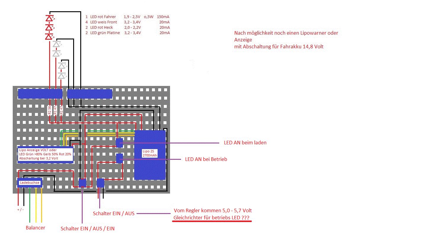 Hallo liebe Elektronikversteher...:-) Ich bin leider kein Genie in diesem Bereich. Kann mir jemand helfen einen Schaltplan zu erstellen. Inklusive Teileliste. Verlöten und zusammenbauen kann ichs dann selber...:-) geplant ist eine Platine 120x80 7 LED,s zum aufklemmen Lipo Akku 1S 7,4V Ladekontrollleuchte mit Kippschalter ein/laden - aus - ein/Licht Lippoanzeige V Ladebuchse/balanceranschluß 5 polig zusätzlicher Schalter extra stromkreis 5V led an Lipowächter 4S 14,8V Akustischer melder ab 3,3V Zelle Vielen Dank