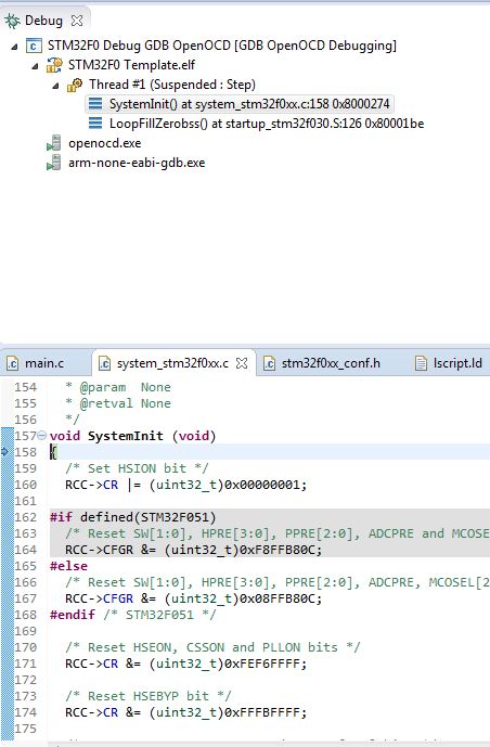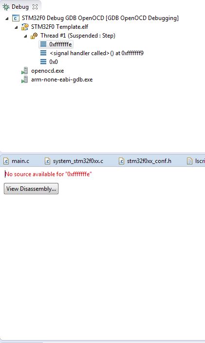 Danke fuer die Muehe. Aber sowas muss man dann doch im Assemblertext durchsteppen. Ich wuerde vermuten das die Vectortabelle nicht in Ordnung ist. Ist der Stackpointer dort richtig initialisiert? Siehe den "merkwuerdigen" Sprung nach 0xfffffff9. "The Cortex-M0 processor does not support unaligned transfers. Any attempt at unaligned memory access results in a hard fault exception." Der Anfang scheint noch richtig zu sein, weil er den Hardfault ueberhaupt anspringt. Der steht an der 4. Position der Tabelle. Zum Analysieren von Hardfaults gibt es eine sehr gute Appnote von TI. Nummer hab ich Moment nicht parat. Viel Erfolg.