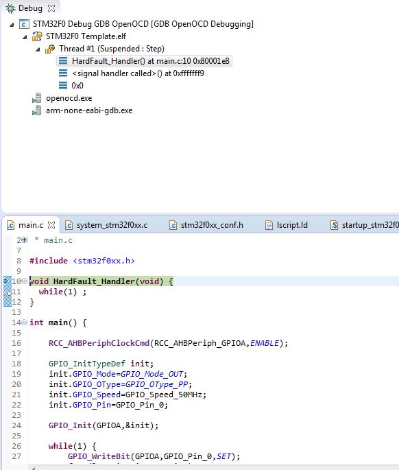 Dort landen alle Faults, und man kann dan die entsprechenden Register im Debugger auslesen. Checke mal den SP, eventuell hast Du den vergessen anzupassen. Cortex M0 ist auch empfindlich bei Alignment Fehlern, was Cortex M3 und M4 nicht so sehr sind.