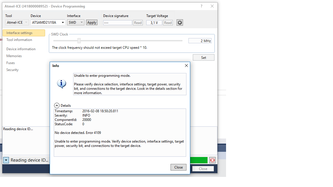 Das bedeutet das er den UC nicht erreichen kann. Dies kann verschiedene Gründe haben: * HW Probleme (defekt, keine Versorgungsspannung, kein Clock, Debugger falsch angeschlossen, Fuses falsch programmiert, ...). * SW Probleme (falsche Einstellungen z.B. verwendeter UC oder Debuginterface/Geschwindigkeit, Treiber Probleme, ...) Du könntest ruhig etwas mehr info geben! Stimmt der eingestellt ATSAM? Was für ein Quarz/int Oszillator wird verwendet? Spannung am UC OK? Wie sieht die Reset Beschaltung aus? Debugger richtig verdrahtet? ...