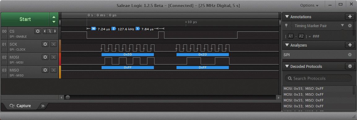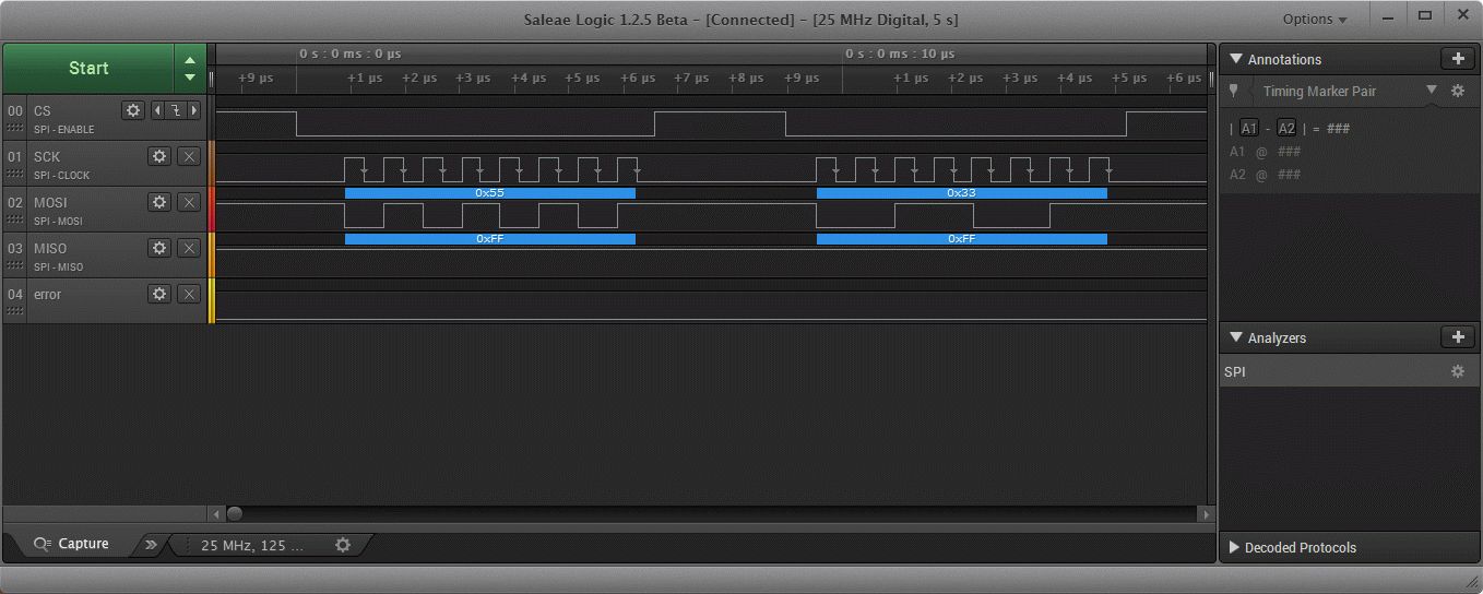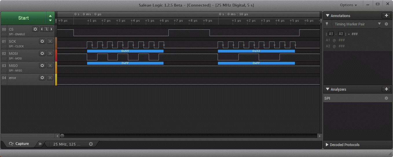Auf der SPI gebe ich 0x55 über die mbed Instanz aus und danach 0x33 über