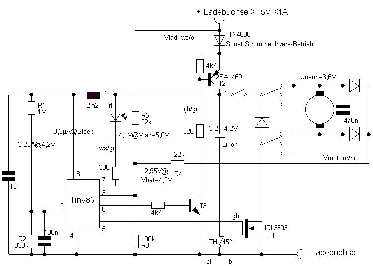 Kjhas A. schrieb: > Die Ladung, die Abschaltüberwachung und Spannungsmessung möchte ich mit > dem µC realisieren. Ich habe das für einen Mini-Schrauber gemacht (siehe Anhang). Für deine unbekannte Anwendung sind sicherlich ein paar Änderungen nötig. Die Funktionen: - Laden über Netzteil mit Strombegrenzung, Abschalten bei 4,2V (T3 und T4) - Unter-Spg-Abschaltung bei 3,2V - Power-Down wenn kein Lade- oder Last-Betrieb - LED blinkt bei Grenzwert-Abschaltung Pin 3 vom Tiny85 hat eine Mehrfachfunktion: - WakeUp bei Ladebetrieb über R5 und bei Lastbetrieb über R4 - danach dient Spg zur Unterscheidung von Lade- und Lastbetrieb - Ist keine Spg vorhanden, wird in PowerDown geschaltet PS: darauf, dass der µC ausfallen kann, bin ich noch nicht gekommen. Ist auch noch bei keiner fertigen Anwendung passiert. Da er im PowerDown alles abschaltet, wird er dann wohl auch nichts einschalten.