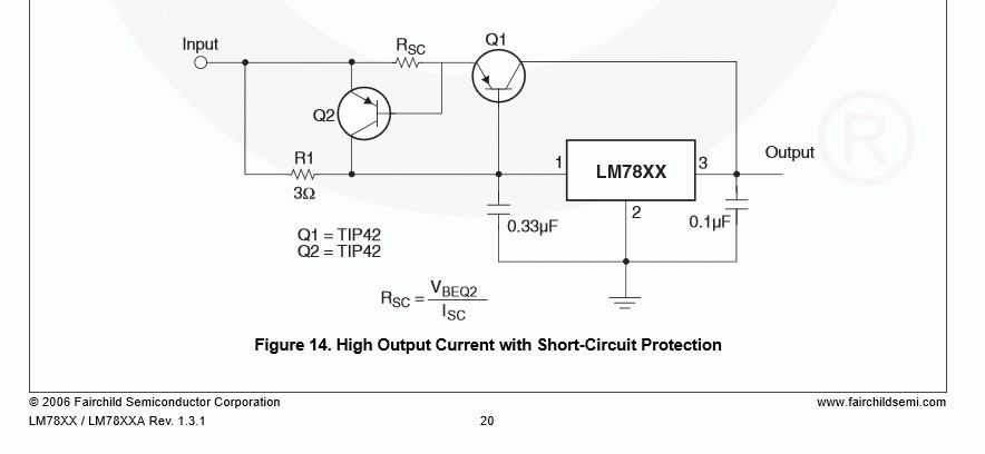 Hallo! Ein paar Fragen zur Auslegung. Das angehängte Bild ist ein Ausschnitt aus dem Datenblatt des LM78xx. Fragen: - Bei der Ermittlung des Rsc bedeutet SC=Short-Circuit (also Kurzschluss)? - Ist VBEQ2, also der Spannungsabfall über die Basis-Emitter-Strecke, nicht IMMER ~0,7V? - Wenn ich den LM7810 verwenden möchte um Vout=10V zu erreichen, kann ich die Schaltung dann mit einem 12V-NT füttern oder wäre dies zu knapp bemessen? Das Diagramm zur Vo/i-Differenz zeigt ja bei etwa 3V die maximale Stromabgabe, sollten dann nicht auch 2V mit Abschlag beim Iout gehen? - Der TIP42 wird mit einem Ic von 6A und 10A peak angegeben, mir würden 4-5A Dauer voerst reichen. Die Strombegrenzung würde ich auf 8A festlegen. Demnach würde Iinput bei max 8.5A betragen. Wie groß müsste dann der Kühlkörper für die TIP42 ausfallen? Mike.