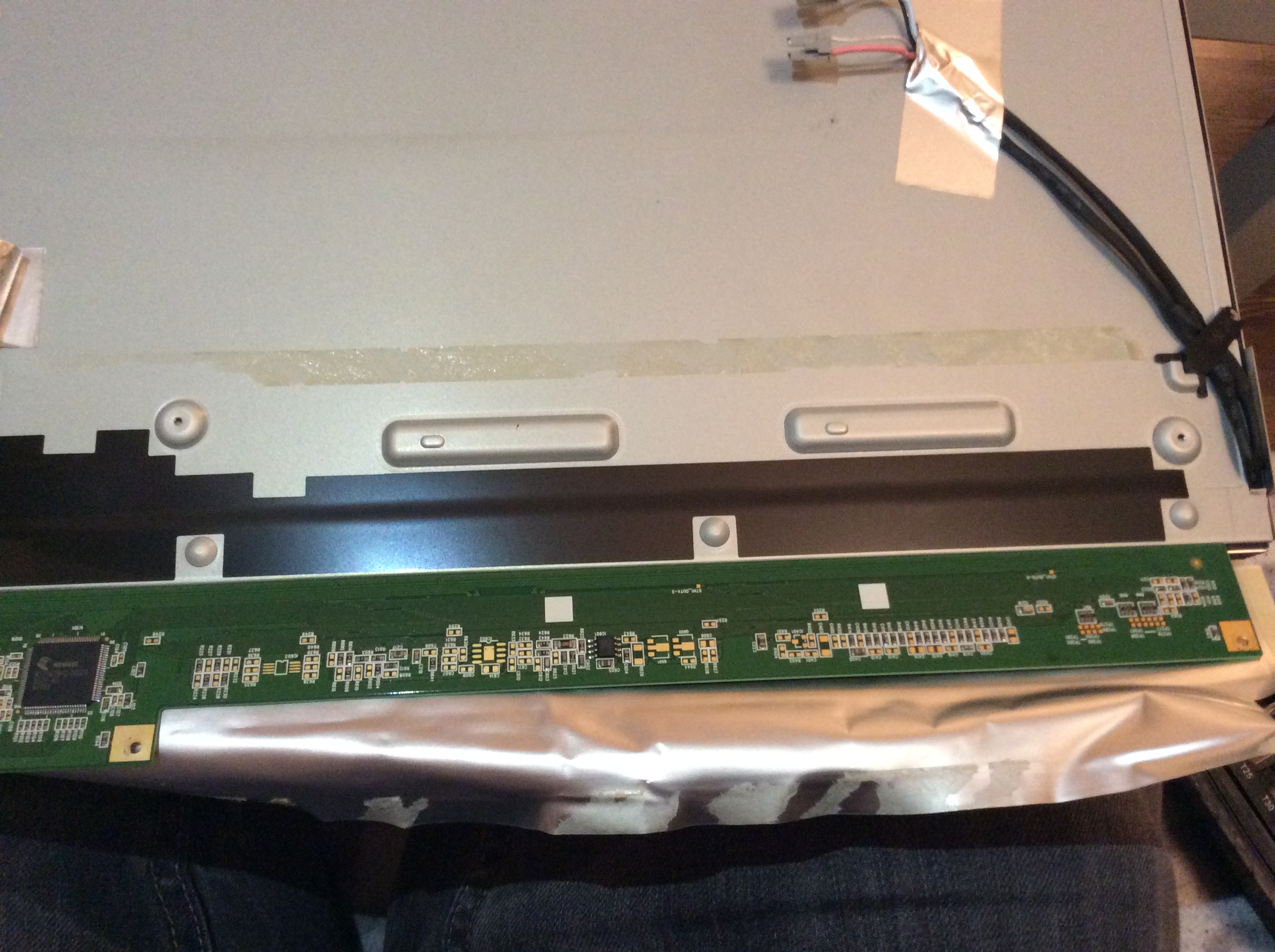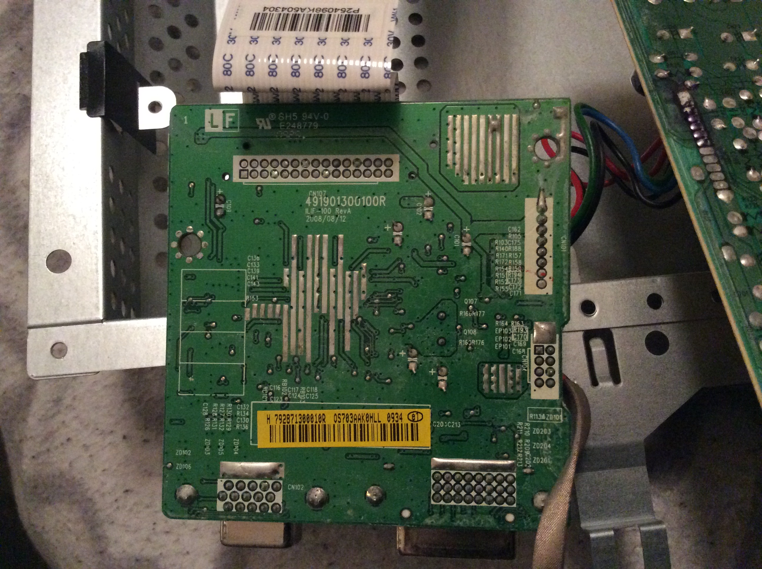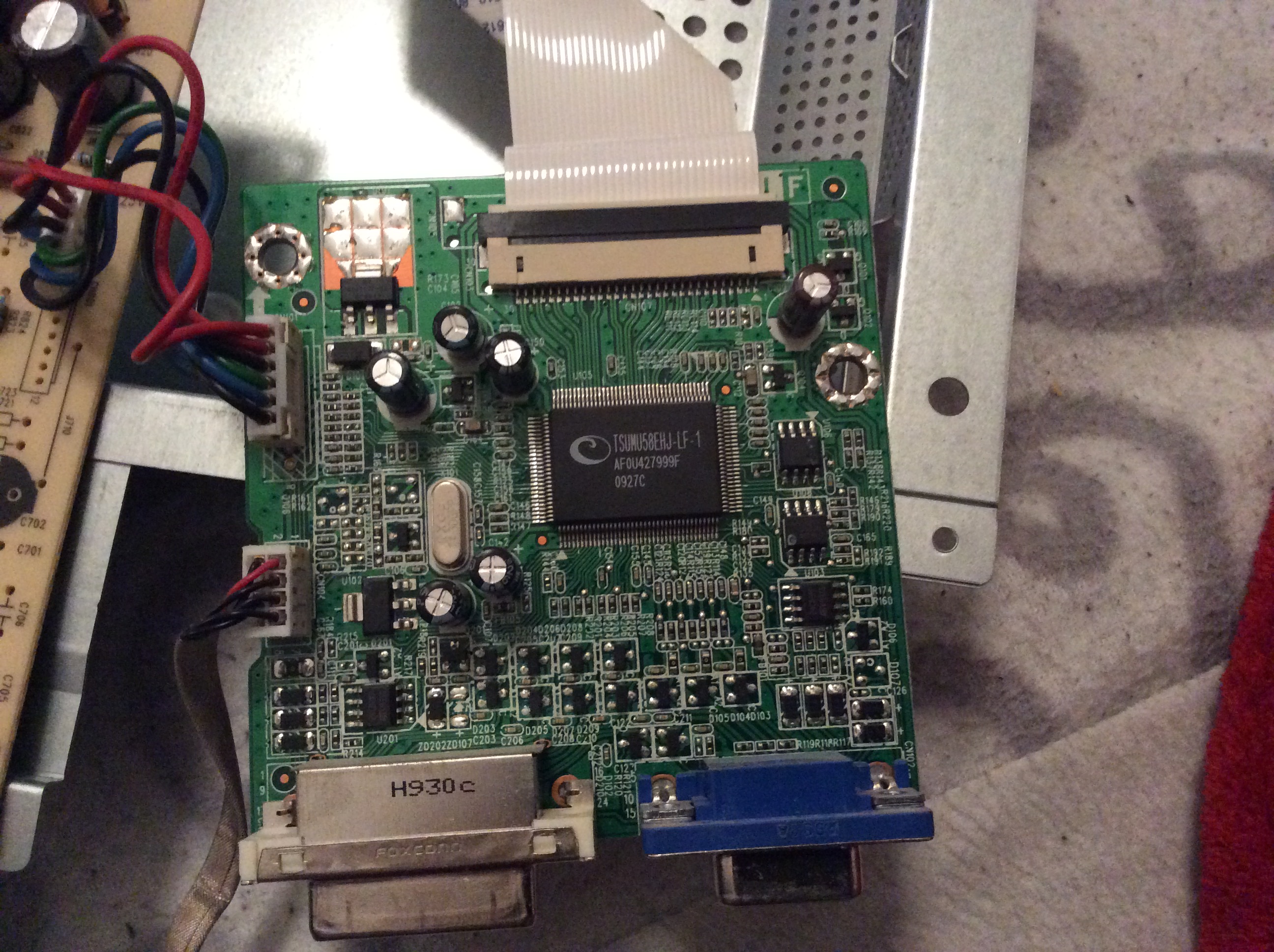 Die Bilder bringen allesamt nichts, weil sie nicht die Elektronik des Panels zeigen, sondern nur das Netzteil mit "Inverter" für die Hintergrundbeleuchtung und die DVI-zu-LVDS-Wandlerelektronik. Die Elektronik des Panels ist Bestandteil des Panels (und anders als bei Fernsehern gibt es in solchen Monitoren kein separates "TCON"). Wie bereits beschrieben sitzt die Panelelektronik am anderen Ende des Folienleiters, den man auf "Foto 2" an CN107 sehen kann. Das Bild vom Monitorbild ist nutzlos, da es vollkommen verrauscht ist.