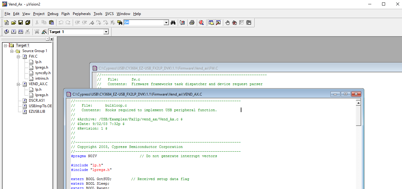 Lade dir das komplette Software Paket für den FX2 herunter, ca. 60MB da ist ein Keil Compiler drin und Code Beispiele, die kannst du anpassen. Der FX2 braucht immer eine Firmware, die im Rom ist nur für den Bootloader. Eigene Firmware kann in das Eeprom oder beim Anstecken nachgeladen werden.