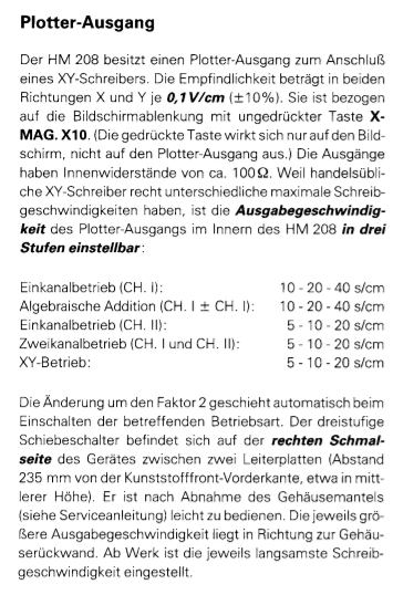 Hallo ich habe hier ein Hameg HM 208 Oszilloskop welches einen Plotterausgang hat. Laut Bedienungsanleitung soll es einen Schalter im Inneren geben, womit man die Geschwindigkeit des Plotterausgangs einstellen kann, ich konnte diesen aber nicht finden. Kann mir jemand mit einem ähnlichen/gleichen Modell vielleicht weiterhelfen, wo dieser Schiebeschalter zu finden ist? Im Anhang ist der Auszug aus der Bedienungsanleitung.