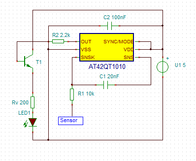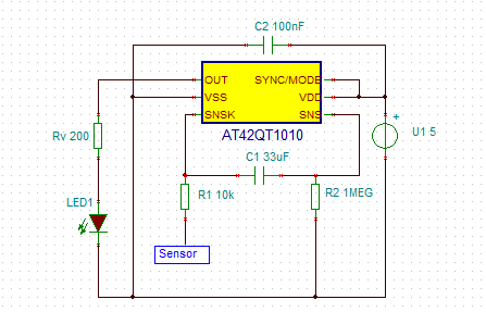 Hallo zusammen, Ich bräuchte mal eure Hilfe. Ich hab jetzt die IC AT42QT1010 bestellt und eine Schaltung entwickelt, aber die gibt nur minimale Spannung am Ausgang (0.2V Höchstens). Wisst ihr vielleicht woran das liegen würde? Als Sensor verwende ich eine 1 Cent Münze. Kein uC/Code, wird glaub nicht gebraucht laut Datenblatt. http://www.atmel.com/images/atmel-9541-at42-qtouch-bsw-at42qt1010_datasheet.pdf