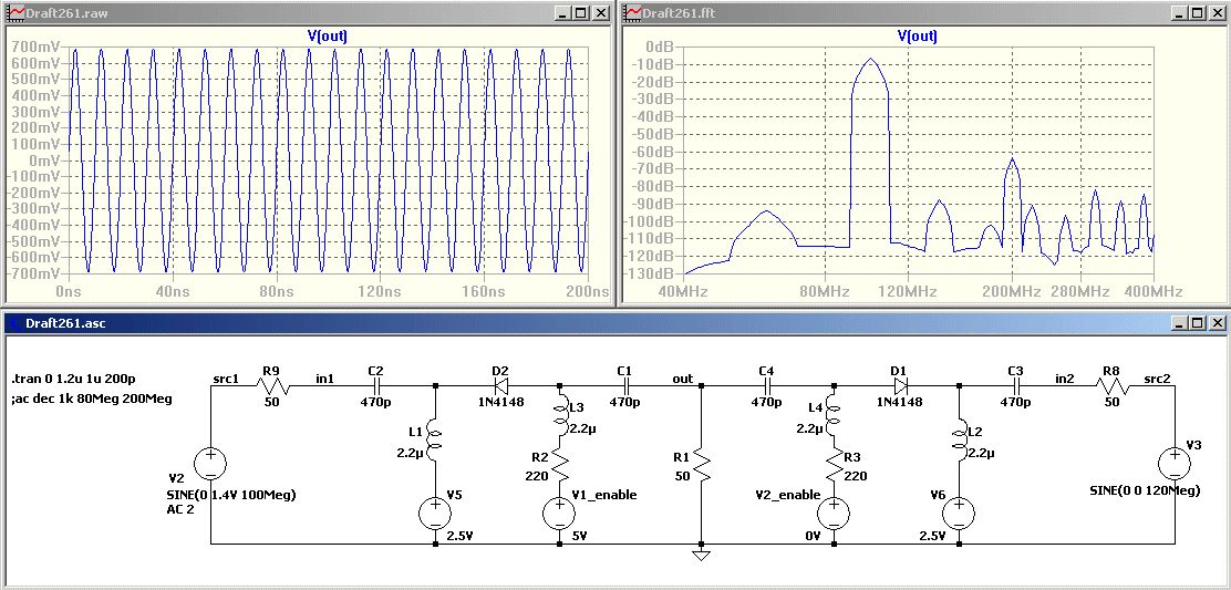 Zu empfehlen ist, bei unbenutzten Oszillatoren die Betriebsspannung abzuschalten. Trotzdem kann man die Ausgänge nicht einfach zusammenschalten, da unbenutzte Oszillatoren das Nutzsignal belasten. Die Idee mit den PIN-Dioden finde ich gut, ich hab jedoch mangels Modell mit einer normalen Schaltdiode simuliert. Die Variante würde so in Kombination mit einem Dioden-Ringmischer funktionieren. Die Eingänge müssen mit einer Impedanz von 50 Ohm angesteuert werden. Mit dem Schaltsignal kann gleichzeitig auch der Oszillator betrieben werden.