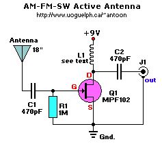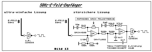Hi, TM, im bisherigen Thread muss ich den Begriff "aktive Antenne" überlesen haben. Trotz der miesen Qualität der Netzfrequenz sucht Du noch immer nach einer Schaltung? Dann 1. Such nach der einfachten "active Antenna", wie die im Anhang - und vergrößere die Kapazitäten, damit sie für 50Hz passen. 2. Schalte ihr ein aktives 50Hz-Filter mit einem OpAmp nach, unter "active Filter" findest Du viele Vorschläge und sogar Programme zur Berechnung der Komponenten. Aber: a) Eine feste Einrichtung kann sich gleich an die nächste Steckdose anschließen. b) Eine mobile Einrichtung hat die zusätzliche Störquelle "Phasenwechsel", und zwar den von Raum zu Raum, je nachdem, an welche Phase des Drehstromnetzes der Installateur die Verkabelung im Raum gehängt hat. Mit der E-Antenne habe ich sogar Nullstellen gefunden, wo sich alle 50Hz- Ausstrahlungen in der Summe gegenseitig auslöschten. Ich bevorzuge DCF77, kann mir aber Anwendungen vorstellen, die dafür zu klein sind und in den Anforderungen genügsam genug. Ciao Wolfgang Horn